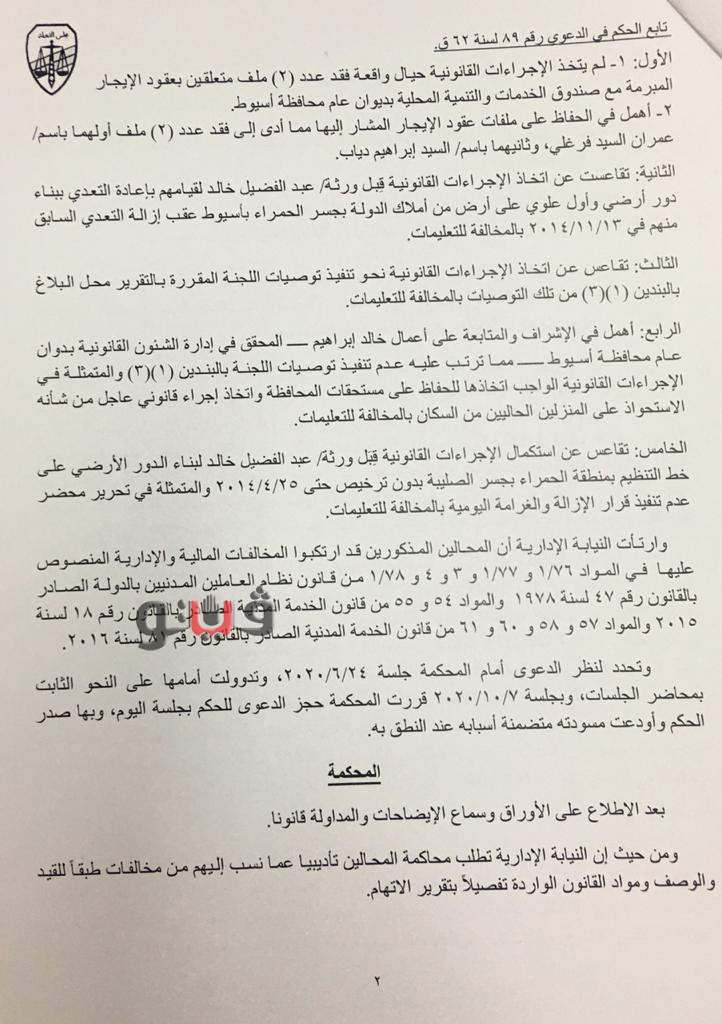 وشمل الحكم بعدم الإختصاص عواطف نسيم إبراهيم، مسئول أملاك الدولة بالوحدة المحلية لحي شرق أسيوط، والتي اتهمتها النيابة الإدارية بالتقاعس عن اتخاذ الإجراءات القانونية بشأن ورثة عبد الفضيل خالد لقيامهم بإعادة التعدي بالبناء على أرض أملاك الدولة عقب إزالة التعدي السابق منهم.