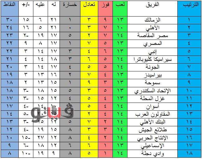 وجاء ترتيب باقي أندية الدوري على النحو الموضح بالجدول المرفق.