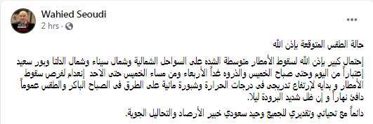 وكتب وحيد سعودي تدوينة على الفيس بوك عن حالة الطقس المتوقعة خلال الفترة المقبلة فقال "الإحتمال كبير بإذن الله لسقوط الأمطار متوسطة الشده على السواحل الشمالية وشمال سيناء وشمال الدلتا وبورسعيد إعتباراً من اليوم وحتى صباح الخميس والذروه غداً الأربعاء".