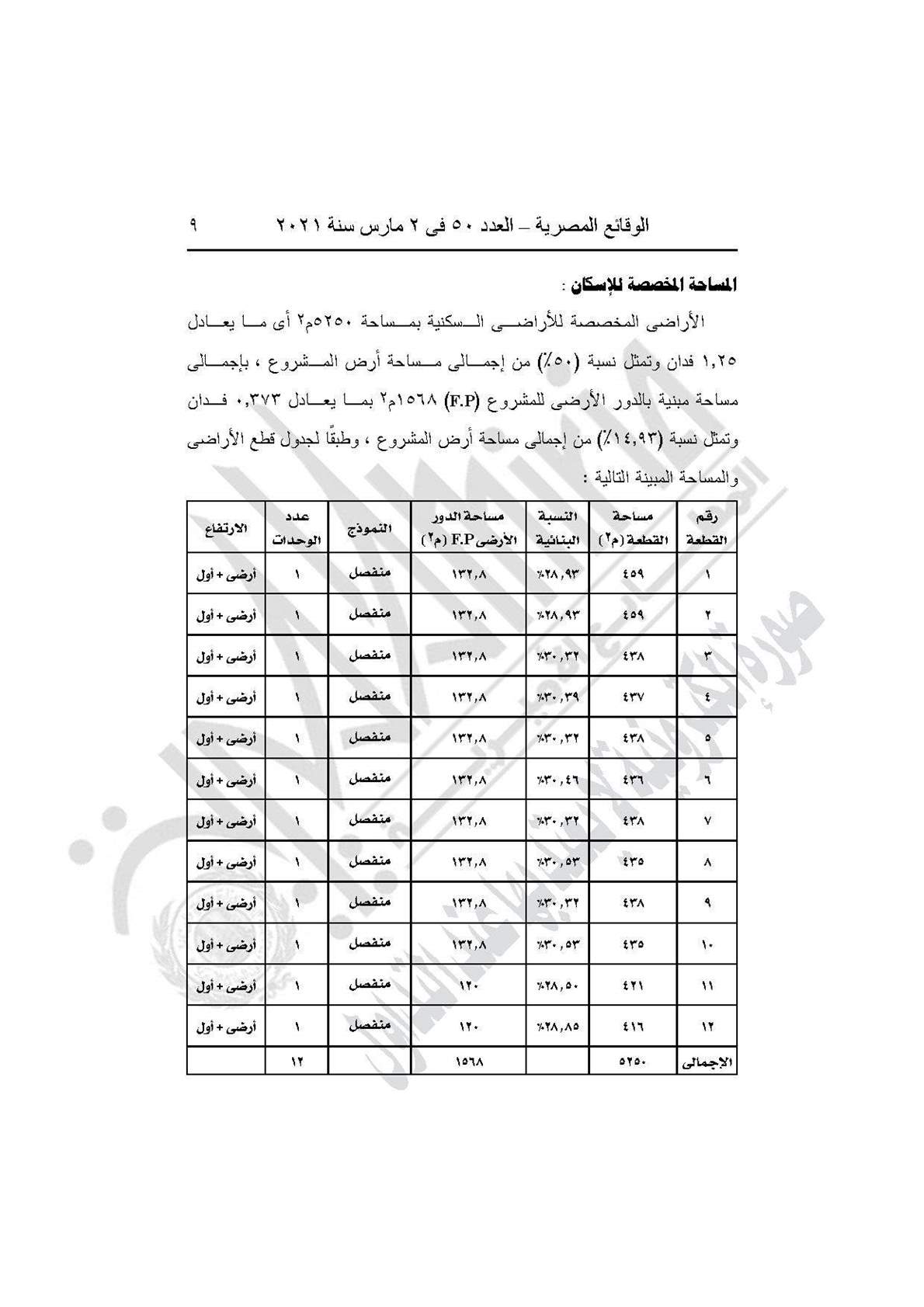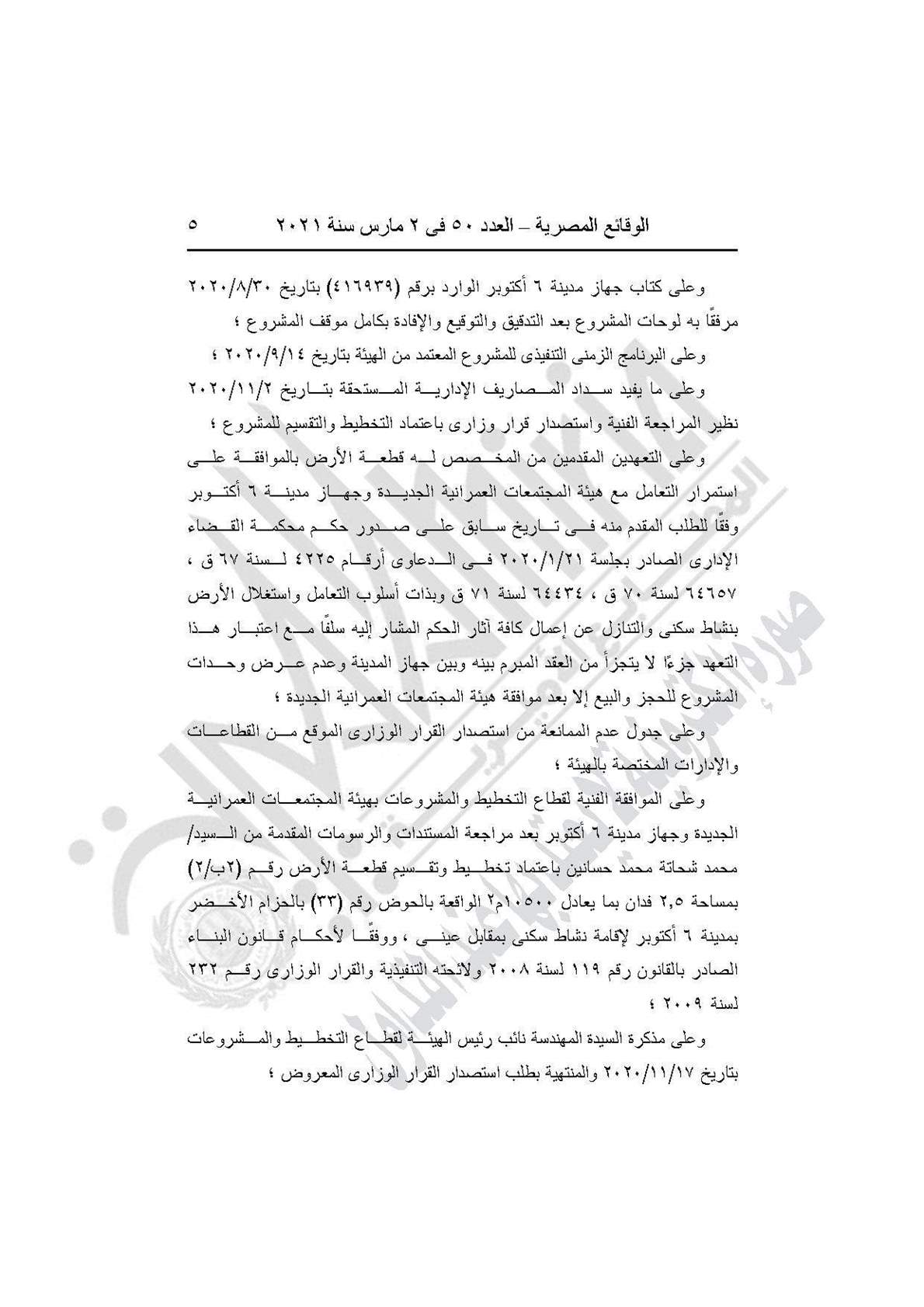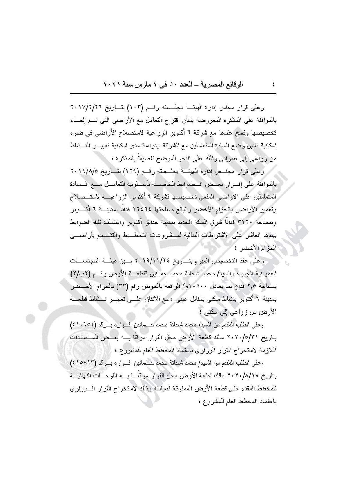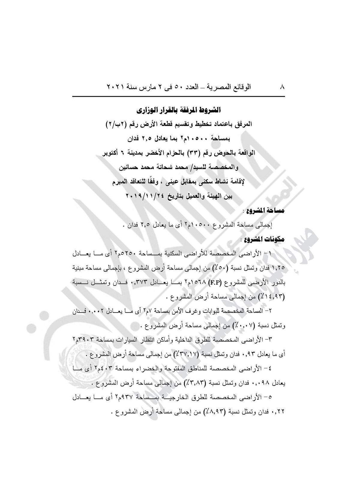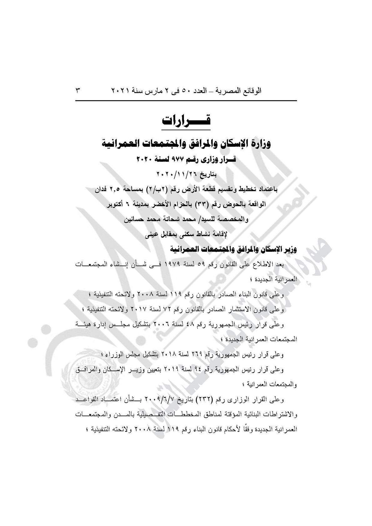 نشرت جريدة الوقائع المصرية في عددها رقم 50، الصادر في 2 مارس 2021، قرار وزارة الإسكان والمرافق والمجتمعات العمرانية رقم 977 لسنة 2020، بشأن اعتماد تخطيط وتقسيم قطعة الأرض رقم (2ب/2) بمساحة 2.5 فدان الواقعة بالحوض رقم (33) بالحزام الأخضر بمدينة 6 أكتوبر والمخصصة لـ محمد شحاته محمد حسانين لإقامة نشاط سكني بمقابل عيني.