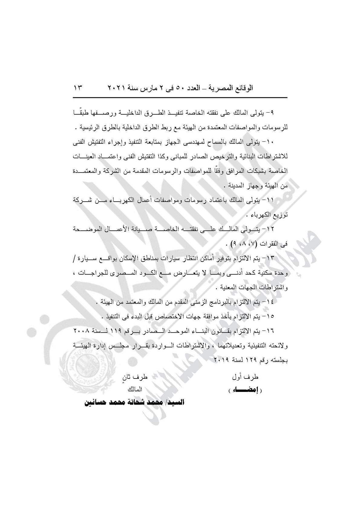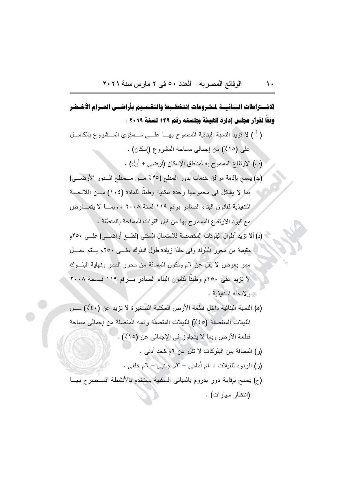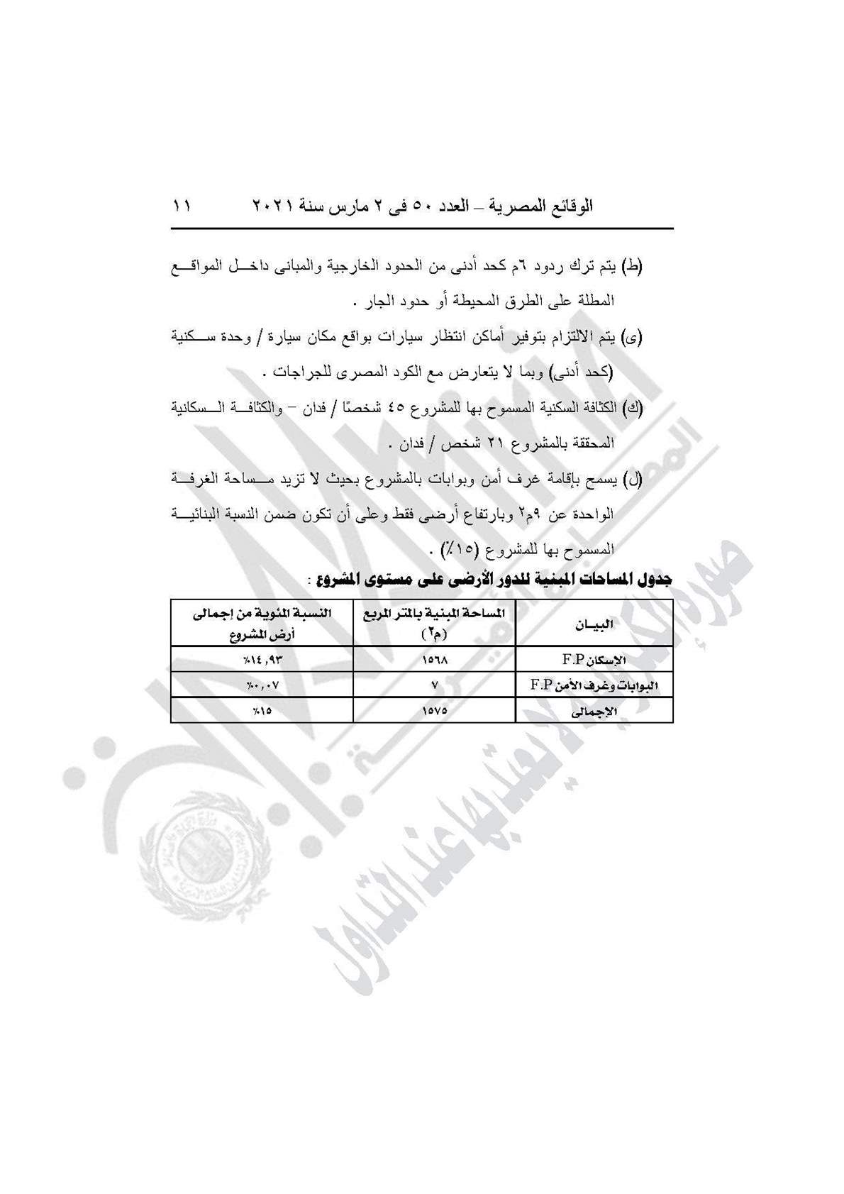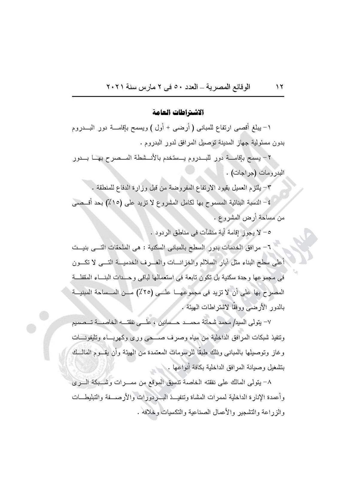 ويلتزم المخصص له بالاشتراط البنائية المعمول بها كحد أقصى وبشرط عدم تجاوز قيود الارتفاع المسموح بها من قبل وزارة الدفاع.