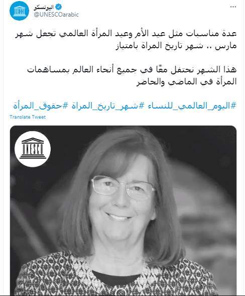 وكتبت منظمة اليونسكو تغريدة على تويتر "عدة مناسبات مثل عيد الأم وعيد المرأة العالمي تجعل شهر مارس.. شهر تاريخ المرأة بامتياز.. هذا الشهر نحتفل معًا في جميع أنحاء العالم بمساهمات المرأة في الماضي والحاضر.. #اليوم_العالمي_للنساء #شهر_تاريخ_المراة #حقوق_المرأة".