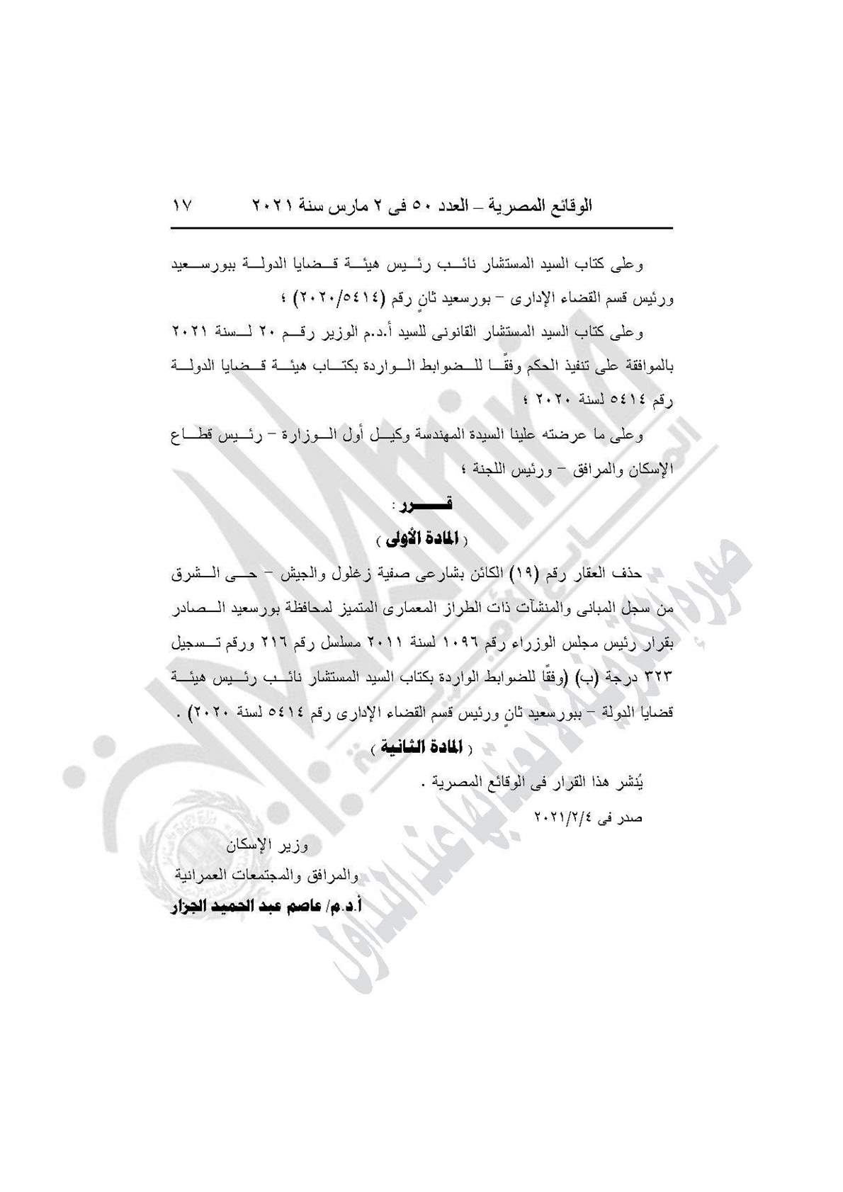 القرار رقم 81 لسنة 2021، وينص على حذف العقار رقم (19) ، الكائن بشارعي صفية زغلول والجيش حي الشرق، من سجل المباني والمنشآت ذات الطراز المعماري المميز لمحافظة بورسعيد ، الصادر بقرار رئيس مجلس الوزراء رقم 1096 لسنة 2011، مسلسل رقم 216 ورقم تسجيل 323 درجة (ب)، وفقًا للضوابط الواردة بكتاب المستشار رئيس هيئة قضايا الدولة، ببورسعيد ثانٍ، ورئيس قسم القضاء الإداري رقم 5414 لسنة 2020.