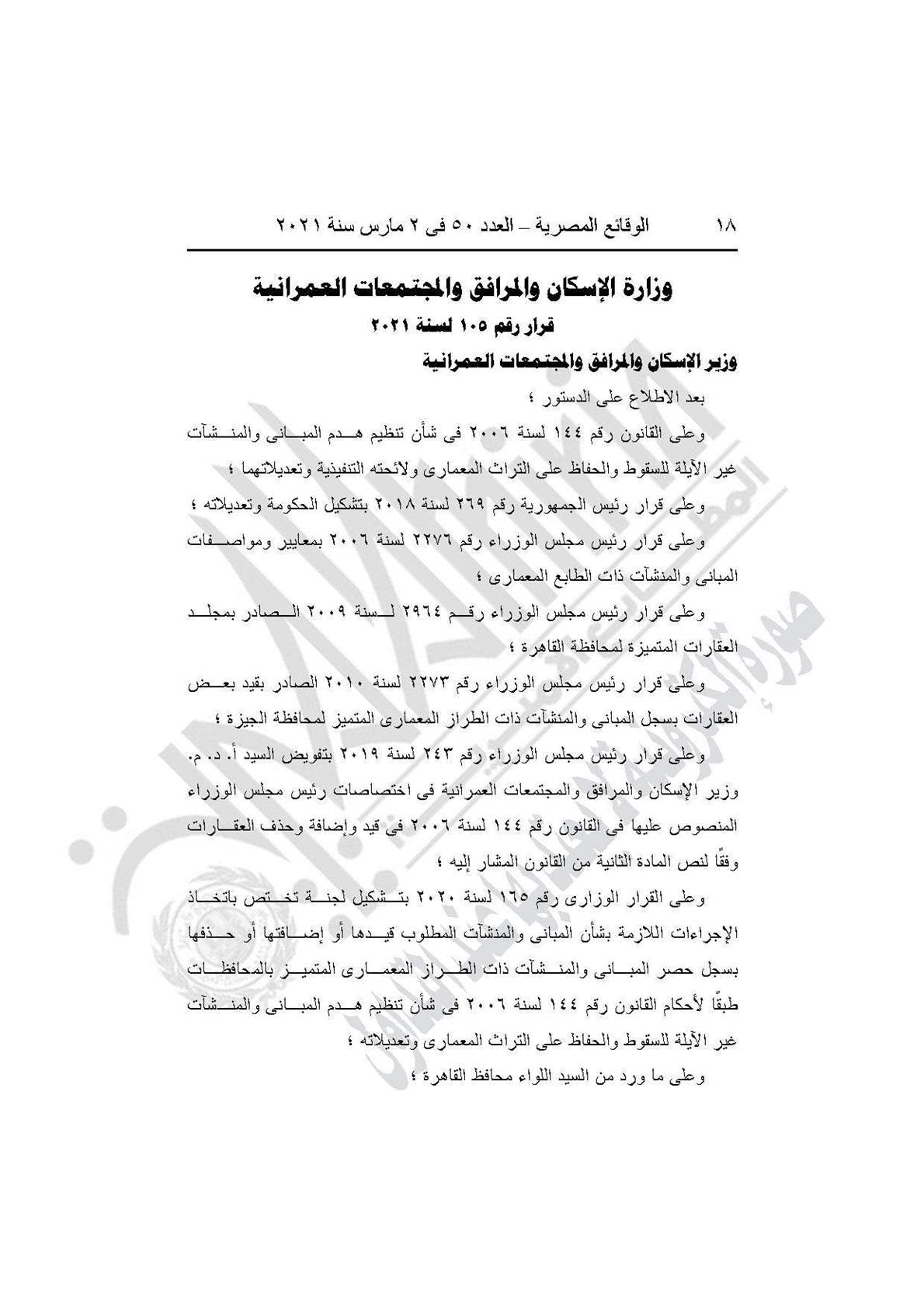 والقرار رقم 105 لسنة 2021، بإضافة العقار رقم 14 شارع الجيش بنطاق حي الموسكي، لسجل المباني والمنشآت ذات الطراز المعماري المتميز لمحافظة القاهرة.
