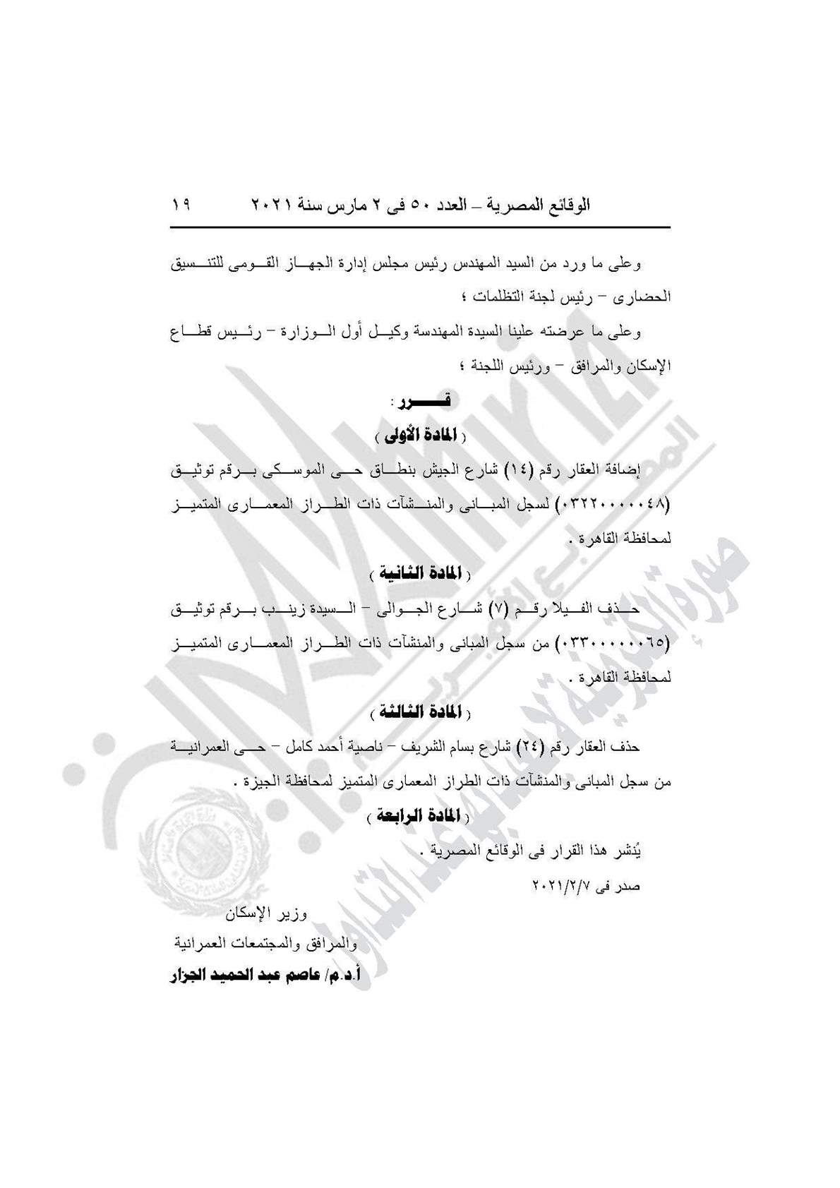 نشرت جريدة الوقائع المصرية في عددها رقم 50، الصادر في 2 مارس 2021، قرار وزارة الإسكان والمرافق والمجتمعات العمرانية بشأن إضافة عقارين لسجل المباني والمنشآت ذات الطراز المعماري المميز لمحافظات بورسعيد والقاهرة، وحذف عقارين من لسجل المباني والمنشآت ذات الطراز المعماري المميز لمحافظات القاهرة والجيزة.