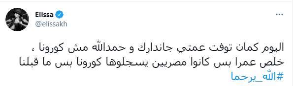 وكتبت إليسا تغريدة على تويتر قالت فيها: "اليوم كمان توفيت عمتي جاندارك وحمدالله مش كورونا ، خلص عمرها بس كانوا مصرين يسجلوها كورونا بس ما قبلنا #الله_يرحمها".