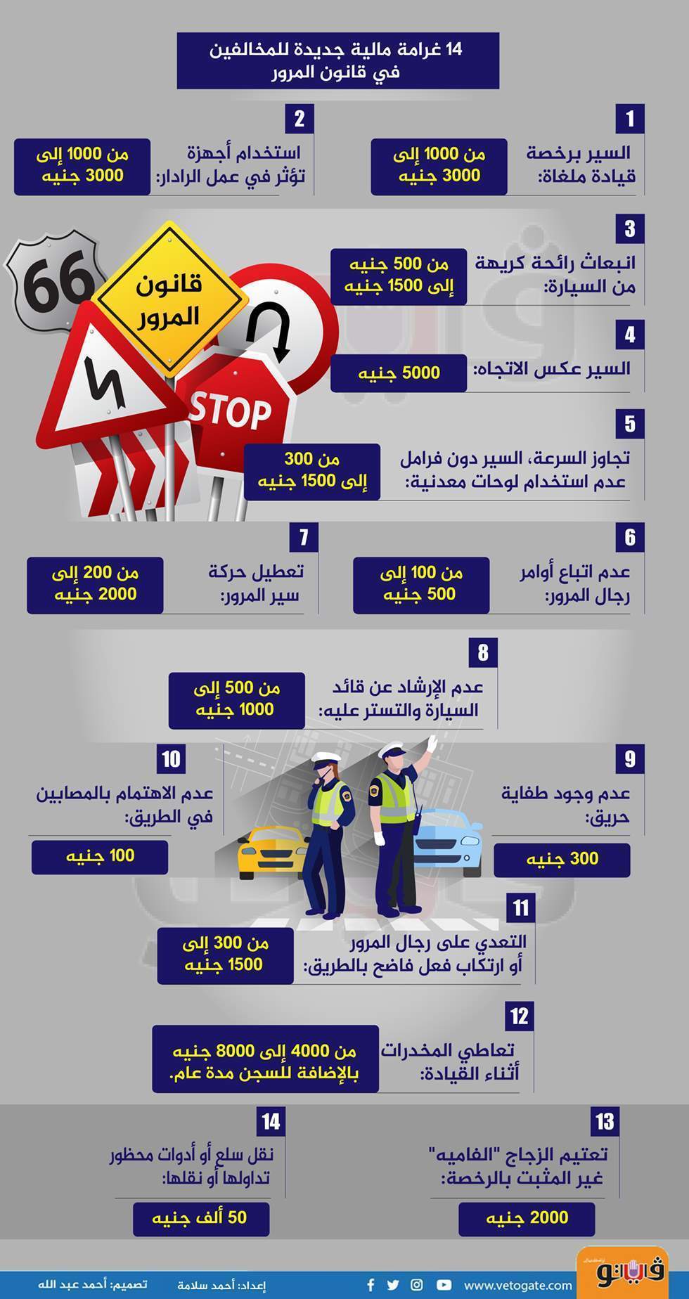 توضح "فيتو" أبرز الغرامات في قانون المرور الجديد، وهي كالتالي: