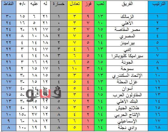 وجاء ترتيب باقي أندية الدوري على النحو الموضح بالجدول المرفق.