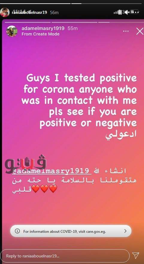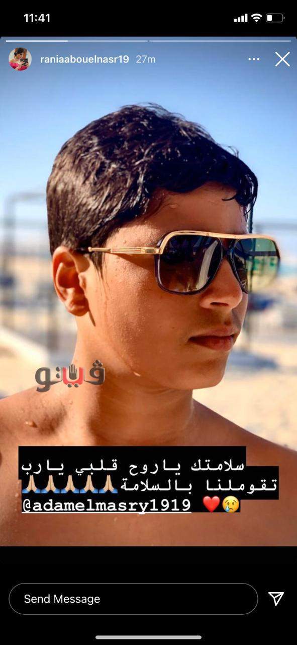 ومن جانبها وجهت رانيا أبو النصر، والدة آدم، رسالة إليه بعد أن أصيب بفيروس كورونا، حيث قالت له في "إستوري إنستجرام": "سلامتك يا روح قلبي، يا رب تقوم لنا بالسلامة".