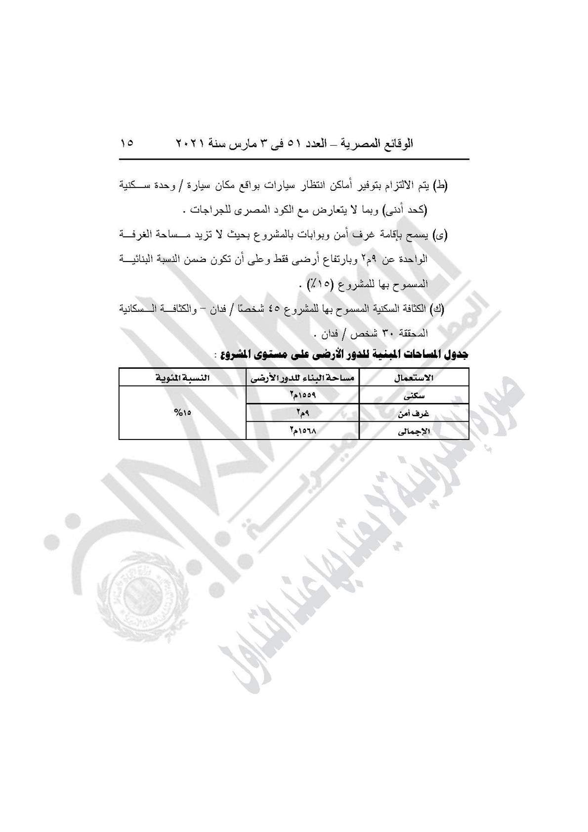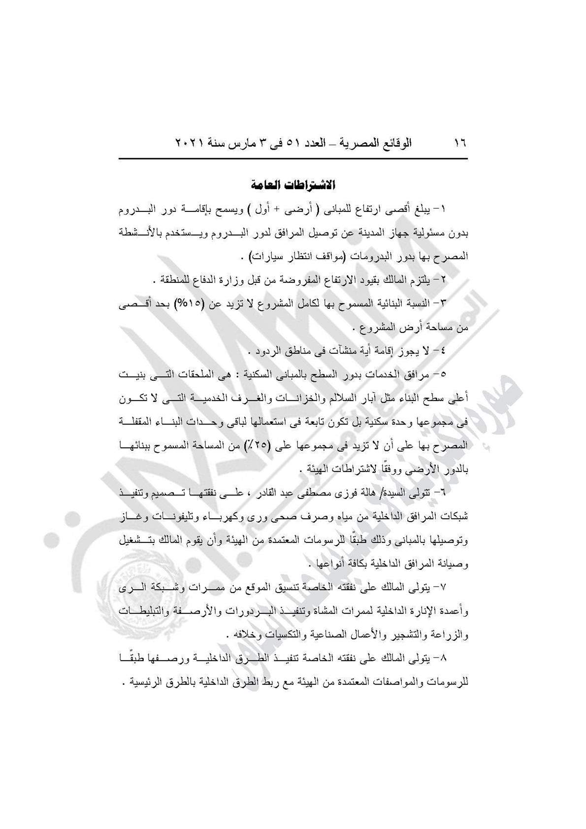 كما تلتزم المخصص لها بالاشتراطات البنائية المعمول بها كحد أقصى وبشرط عدم تجاوز قيود الارتفاع المسموح بها من قبل وزارة الدفاع.