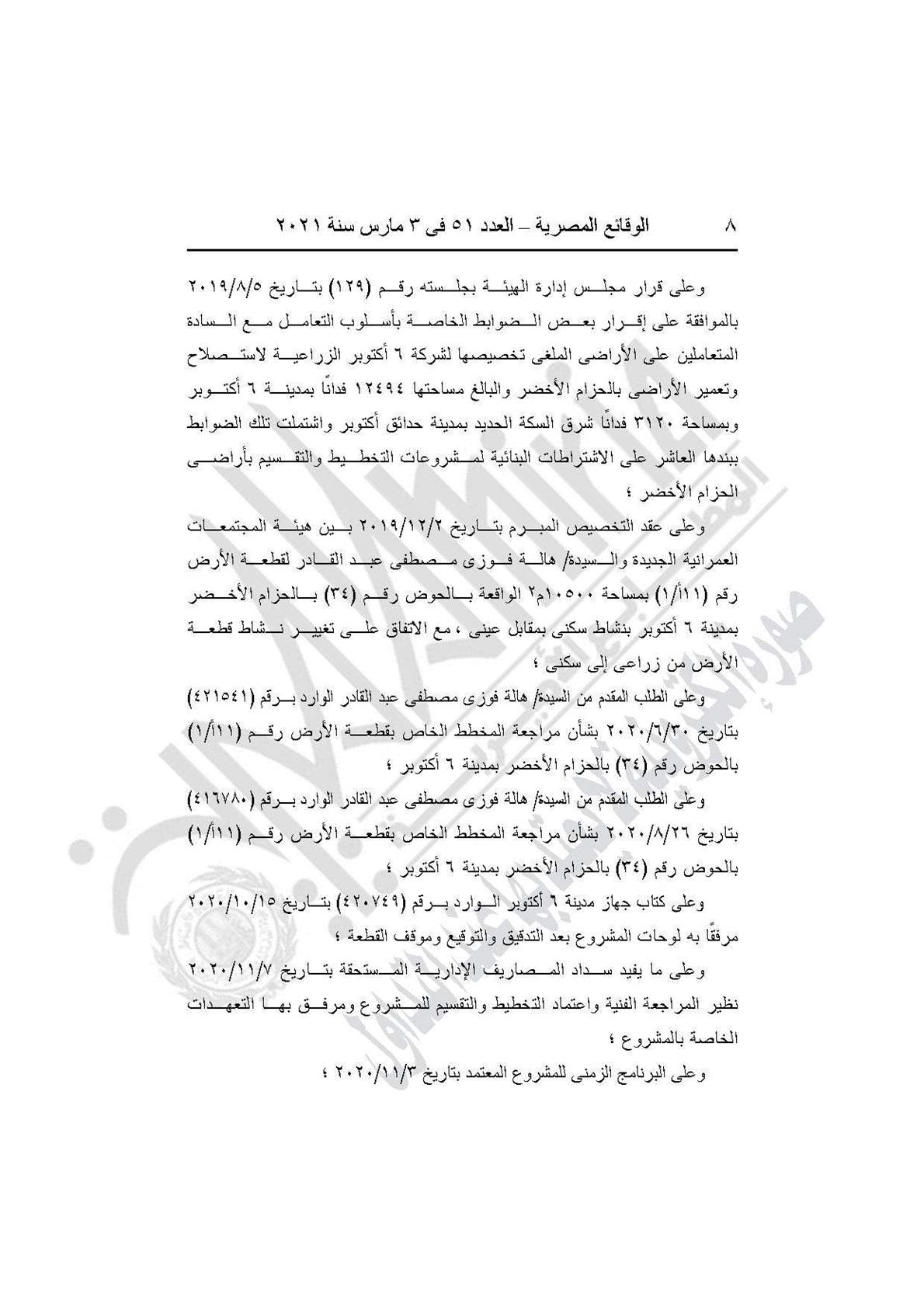 نشرت جريدة الوقائع المصرية في عددها رقم 51، الصادر في 3 مارس 2021، قرار وزارة الإسكان والمرافق والمجتمعات العمرانية رقم 978 لسنة 2020، باعتماد تخطيط وتقسيم قطعة الأرض رقم (11أ/1) بمساحة 2.5 فدان الواقعة بالحوض رقم (34) بالحزام الأخضر بمدينة 6 أكتوبر والمخصصة لـ هالة فوزى مصطفى عبد القادر لإقامة نشاط سكنى بمقابل عينى.