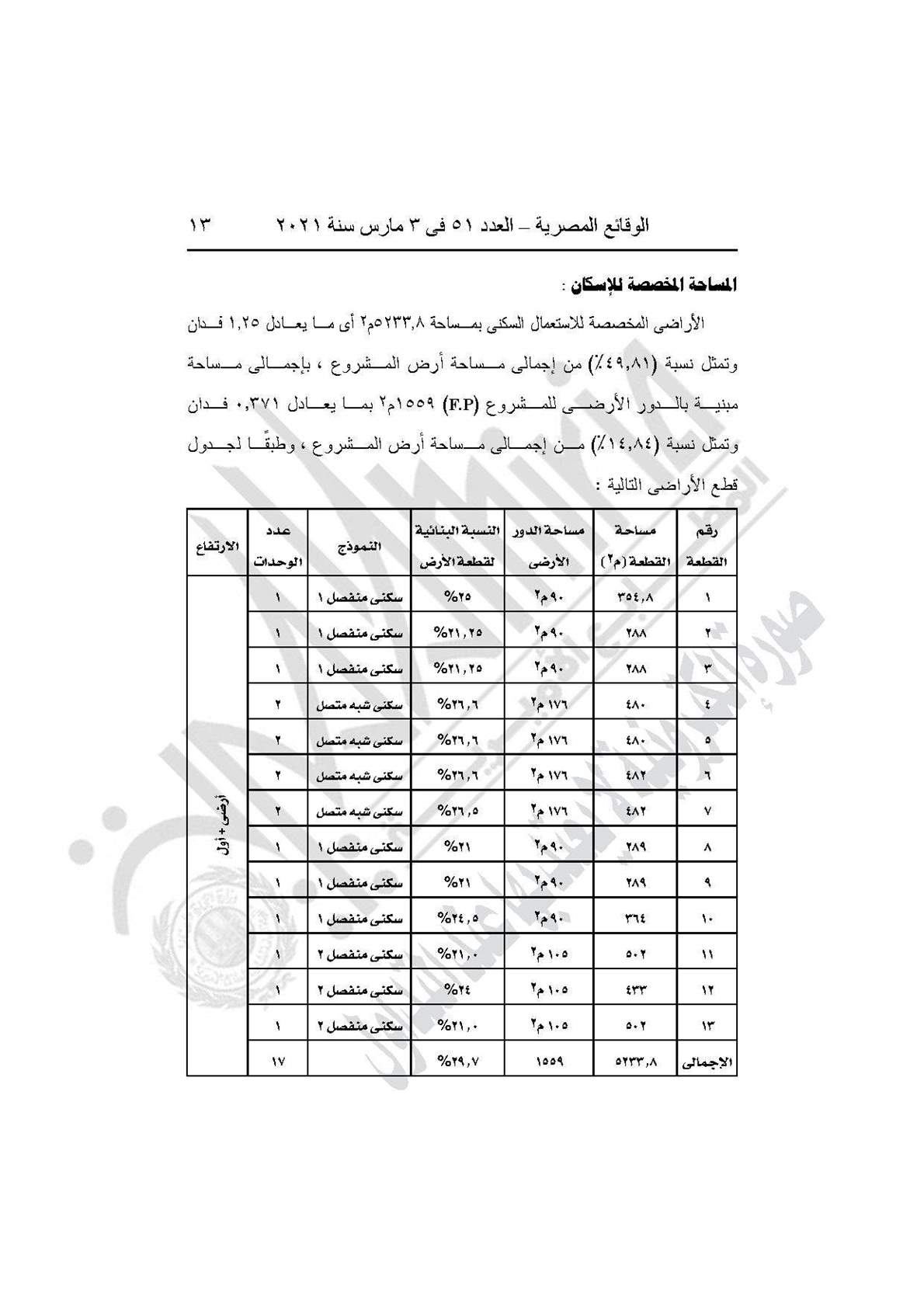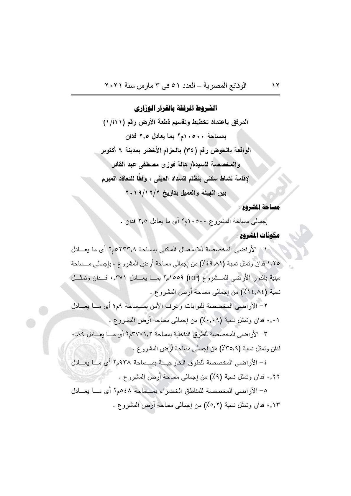 وتنص المادة الأولى للقرار على تخطيط وتقسيم قطعة الأرض رقم (11أ/1) بمساحة 2.5 فدان بما يعادل 10500 متر مربع، الواقعة بالحوض رقم (34) بالحزام الأخضر بمدينة 6 أكتوبر والمخصصة لـ هالة فوزى مصطفى عبد القادر، لإقامة نشاط سكنى بمقابل عينى، وذلك طبقًا للحدود الموضحة على الخريطة المرفقة بهذا القرار والعقد المبرم بتاريخ 2/12/2019 والتى تعتبر جميعها مكملة لهذا القرار.