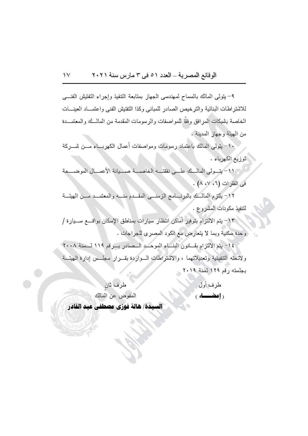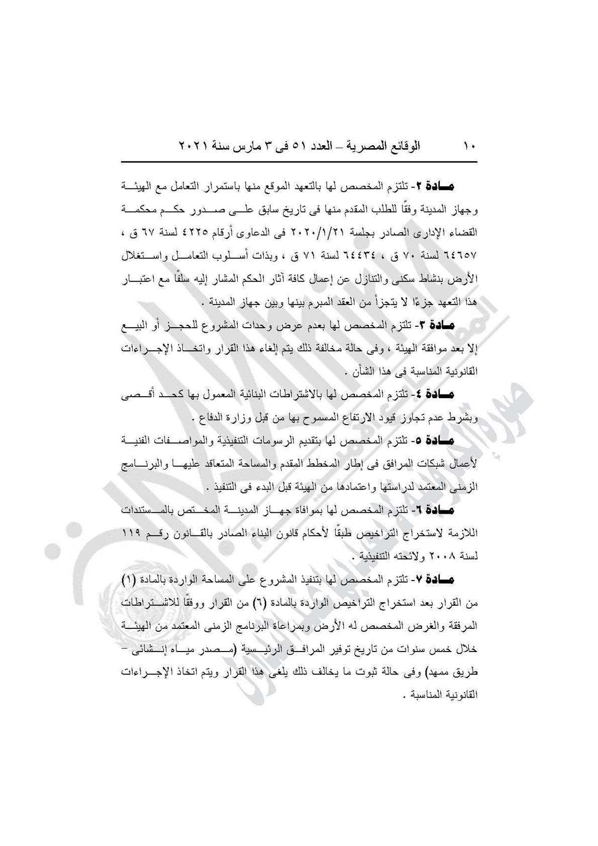وفي المـادة السادسة تلتزم المخصص لها بموافاة جهاز المدينة المختص بالمستندات اللازمة لاستخراج التراخيص طبقًا لأحكام قانون البناء الصادر بالقانون رقم 119 لسنة 2008 ولائحته التنفيذية . مـادة 7- تلتزم المخصص لها بتنفيذ المشروع على المساحة الواردة بالمادة (1) من القرار بعد استخراج التراخيص الواردة بالمادة (6) من القرار ووفقًا للاشتراطات المرفقة والغرض المخصص له الأرض وبمراعاة البرنامج الزمنى المعتمد من الهيئة خلال خمس سنوات من تاريخ توفير المرافق الرئيسية (مصدر مياه إنشائى - طريق ممهد) وفى حالة ثبوت ما يخالف ذلك يلغى هذا القرار ويتم اتخاذ الإجراءات القانونية المناسبة.