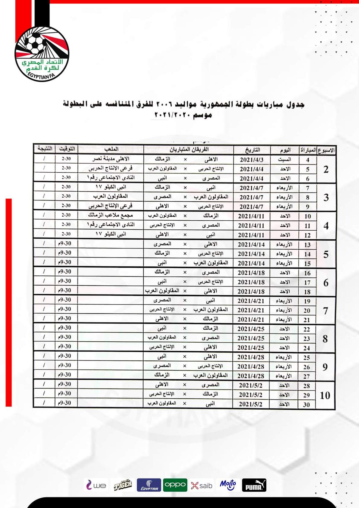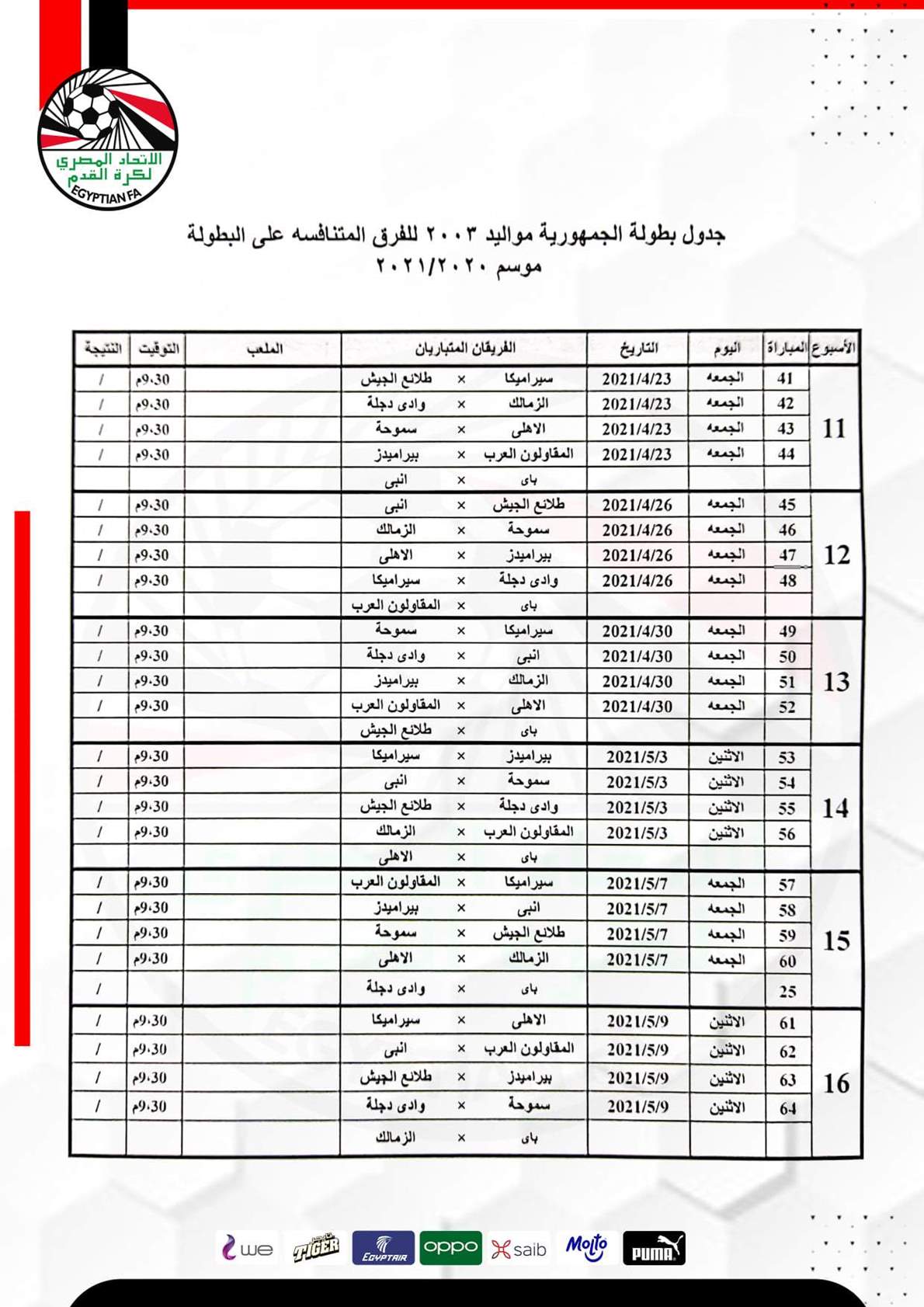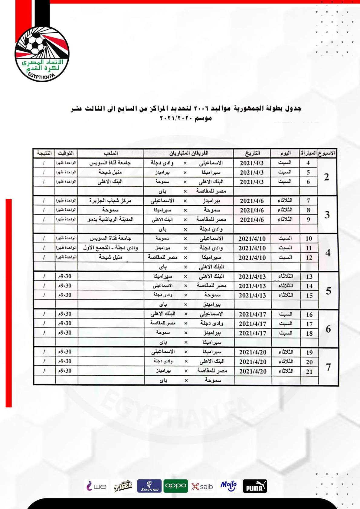 مواعيد دوري الجمهورية للشباب مواليد 99
