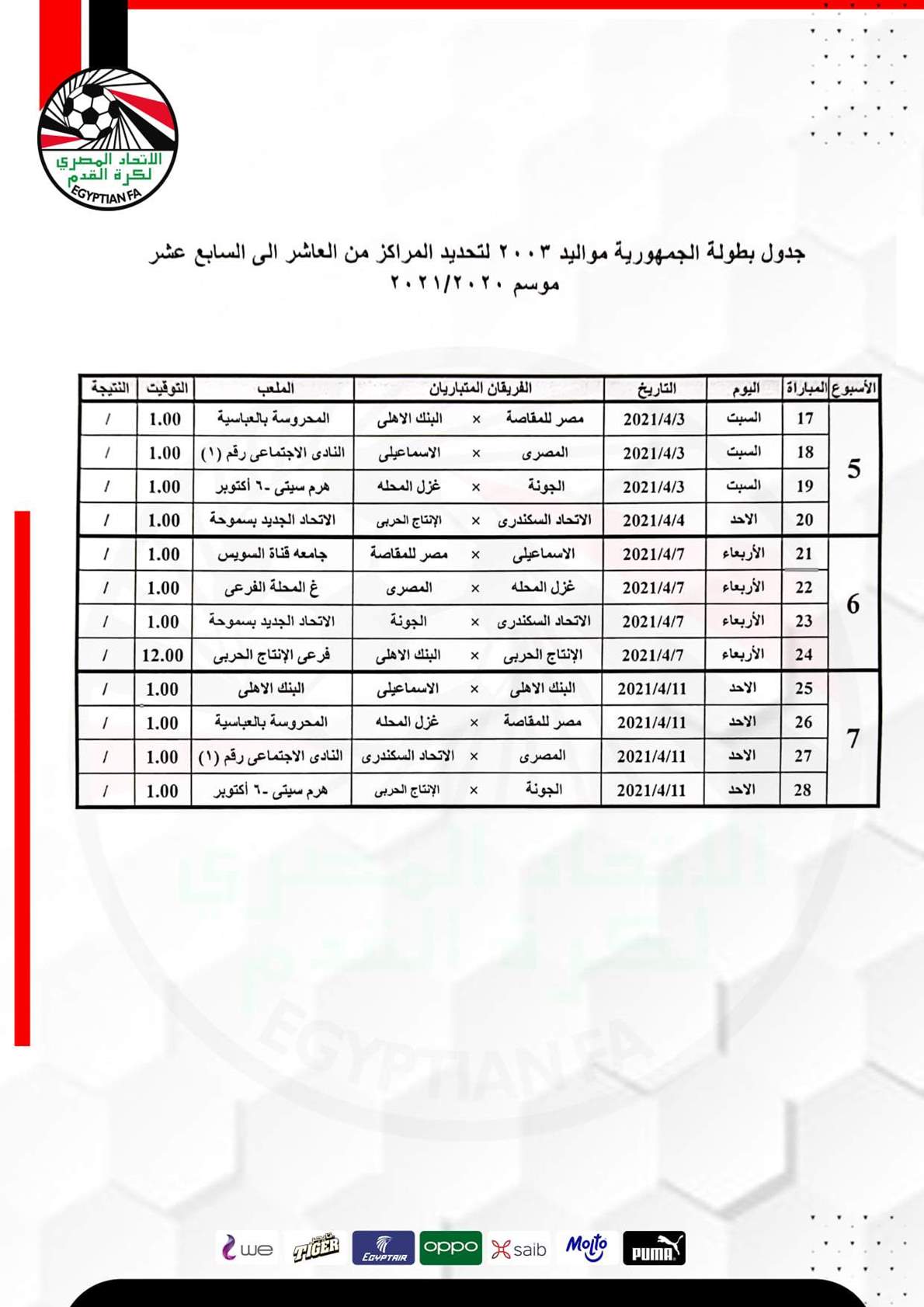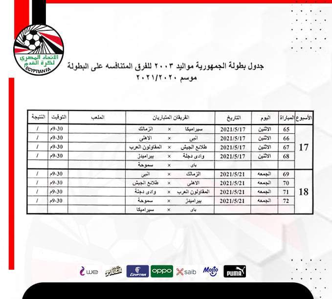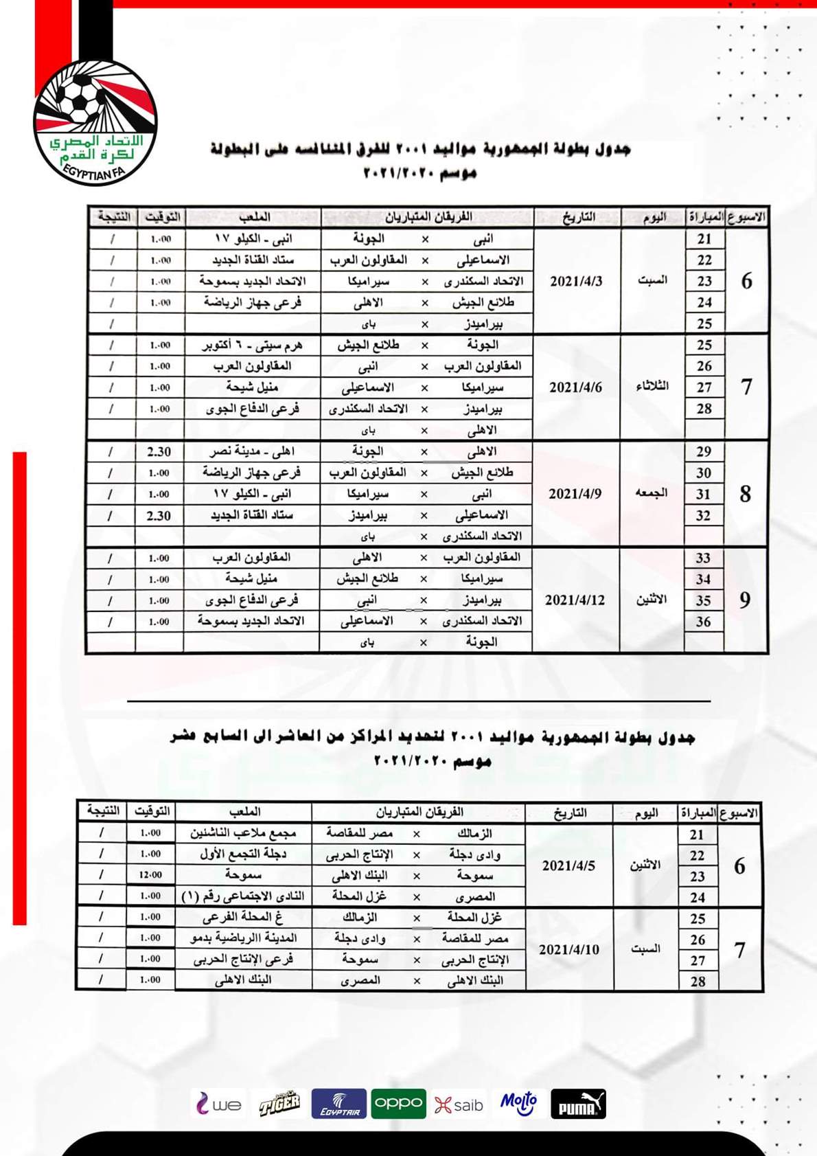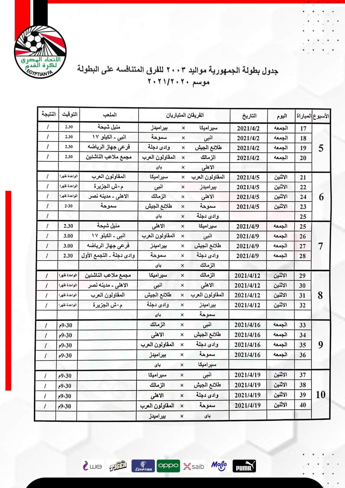 مواعيد دوري الجمهورية للشباب مواليد 99