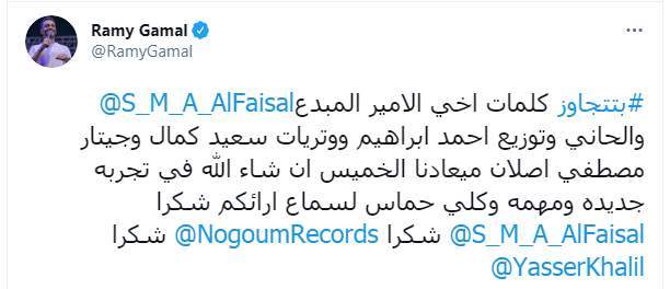 وكان رامي جمال كتب في تغريدة سابقة "#بتتجاوز كلمات أخي الأمير المبدع @S_M_A_AlFaisal وألحاني وتوزيع أحمد إبراهيم ووتريات سعيد كمال وجيتار مصطفى أصلان، ميعادنا الخميس إن شاء الله في تجربة جديدة ومهمة وكلي حماس لسماع آرائكم شكرا @S_M_A_AlFaisal شكرا @NogoumRecords شكرا @YasserKhalil".