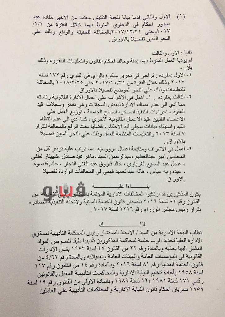 وأكد تقرير الاتهام أن المحال الأول بمفرده تراخى في تحرير مذكرة بالرأي في الفتوى رقم 172 لسنة 2017 بالمخالفة للتعليمات، وأهمل المحال الثالث بمفرده الإشراف على أعمال الإدارة القانونية رئاسته مما أدى إلى عدم إمساك الإدارة لسجلات ودفاتر قيد العقود وإجراءات التنفيذ الصادرة لصالح الجامعة جهة عمله وتوزيع العمل على الأعضاء الفنيين، وعدم قيد الأعمال الأعمال القانونية الأخرى مما أدى الى عدم استيفاء بيانات سجلي قيد الأحكام والقضايا تحت الرفع، أهمل المحال الثالث في الإشراف ومتابعة أعمال مروؤسيه مما أدى إلى إرتكابهم مخالفات قانونية .