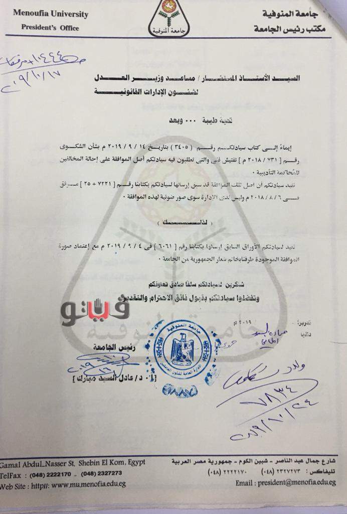 وأرفق مع مذكرة رئيس الجامعة ملف الشكوى ومذكرة إدارة التفتيش الفني على الإدارات القانونية بوزارة العدل مؤشرًا عليه من الدكتور عادل السيد مبارك، رئيس جامعة المنوفية بالموافقة على طلب مساعد وزير العدل بالإحالة للمحاكمة التأديبية.