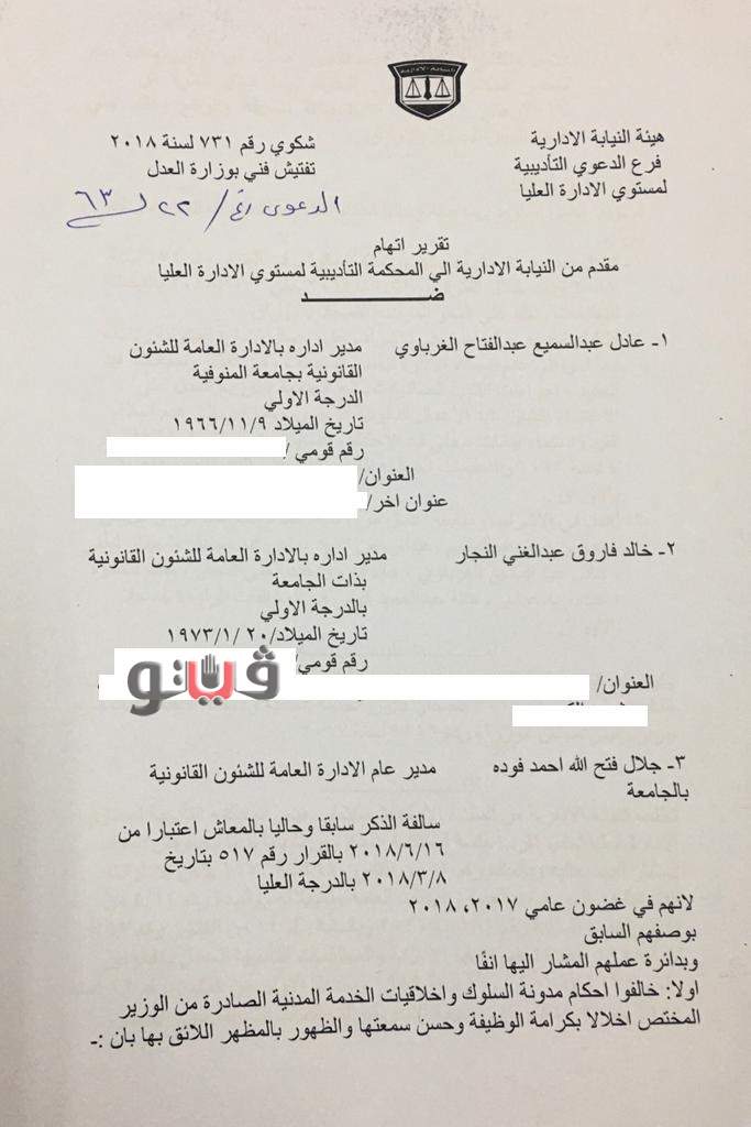 قررت وزارة العدل في القضية رقم 22 لسنة 63 قضائية عليا إحالة مدير عام الإدارة العامة للشئون القانونية بجامعة المنوفية، ومديرين آخرين من مساعديه للمحاكمة التأديبية العاجلة بعد ثبوت إرتكابهم مخالفات قانونية وإدارية.