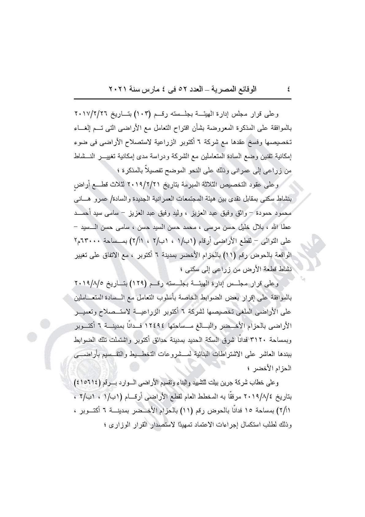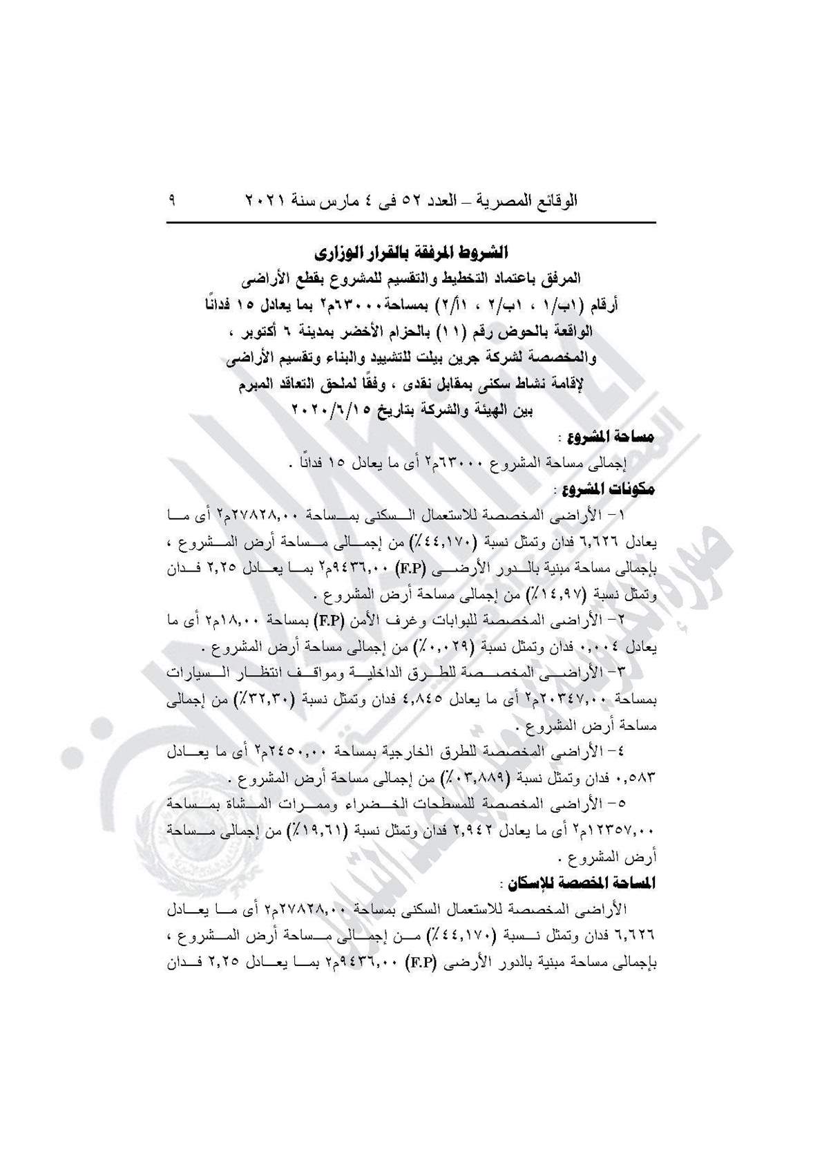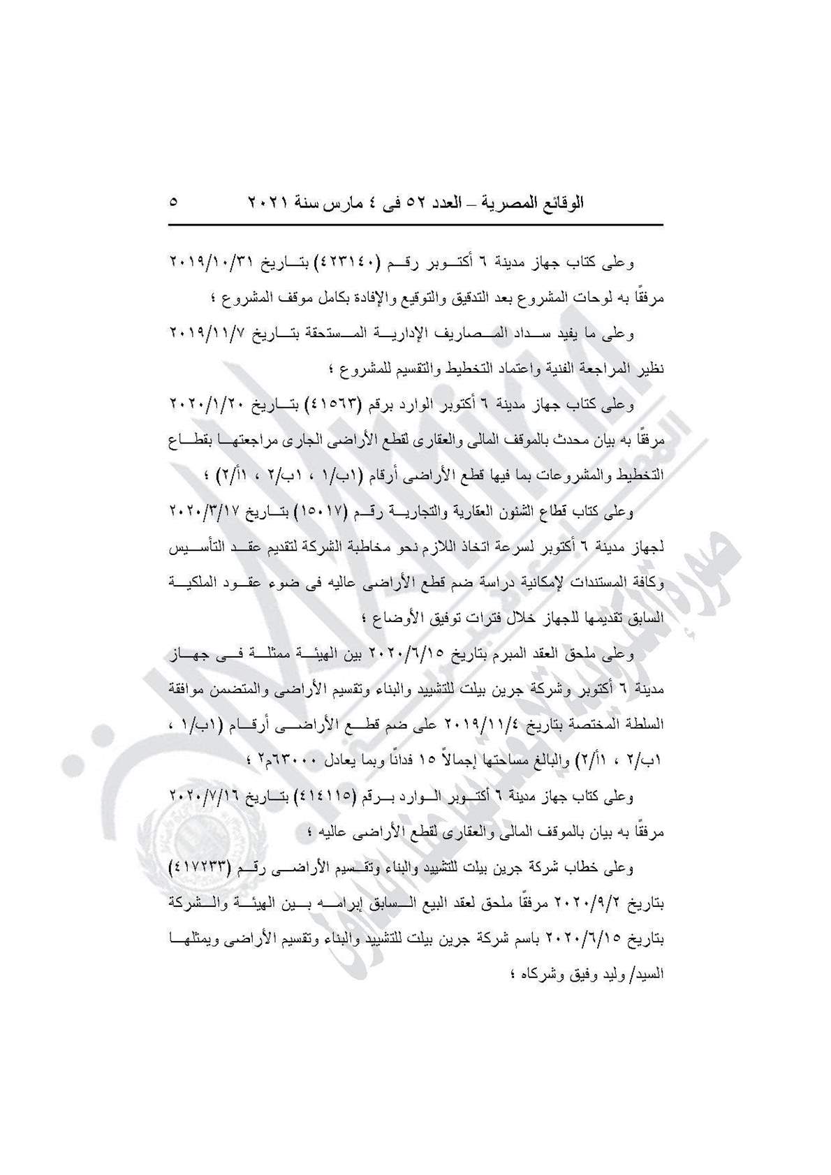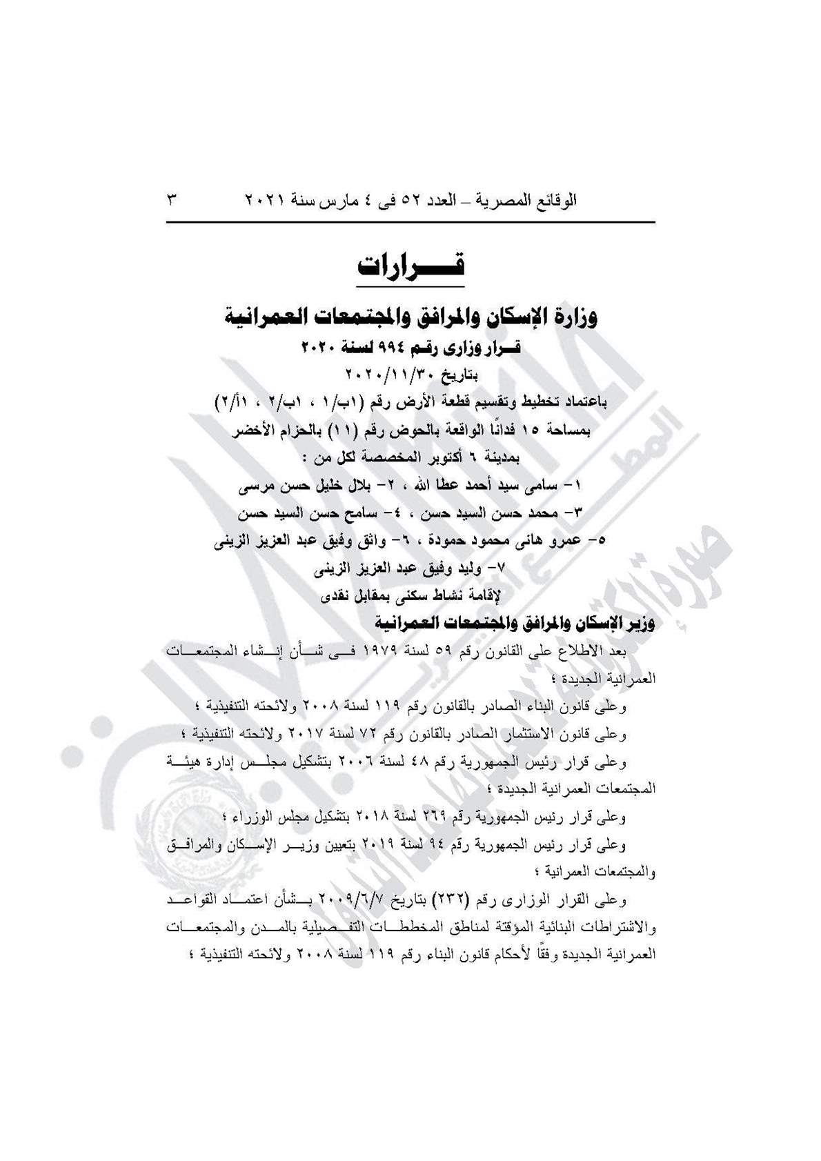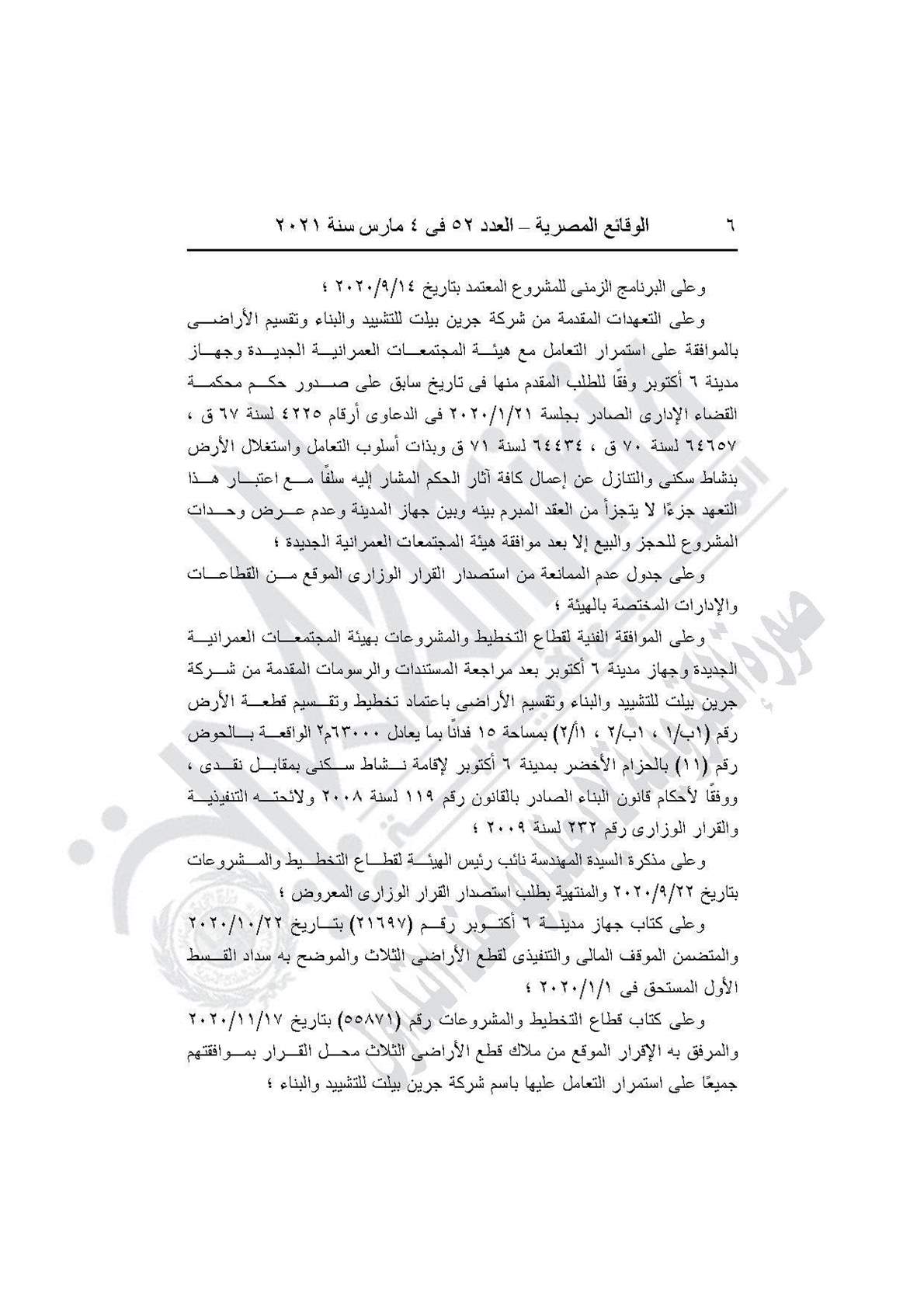 نشرت جريدة الوقائع المصرية في عددها رقم 52، الصادر في 4 مارس 2021، قرار وزارة الإسكان والمرافق والمجتمعات العمرانية رقم 994 لسنة 2020، باعتماد تخطيط وتقسيم قطعة الأرض رقم (1ب/1، 1ب/2، 1أ/2) بمساحة 15 فدانًا الواقعة بالحوض رقم (11) بالحزام الأخضر بمدينة 6 أكتوبر لإقامة نشاط سكني بمقابل نقدي.