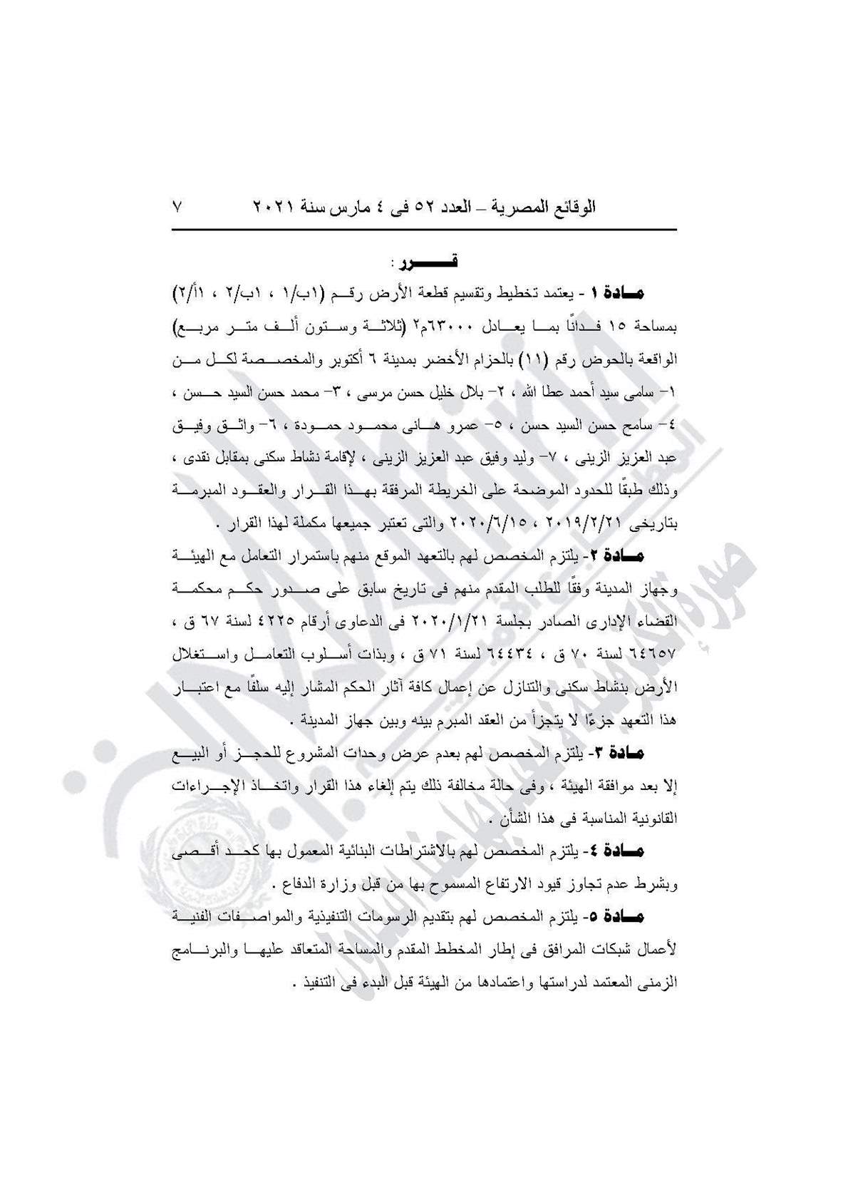 وينص القرار في مادته الأولى على اعتماد تخطيط وتقسيم قطعة الأرض رقم (1ب/1، 1ب/2، 1أ/2) بمساحة 15 فدانًا، بما يعادل 63000 متر مربع، الواقعة بالحوض رقم 11 بالحزام الأخضر بمدينة 6 أكتوبر والمخصصة لكل من سامي سيد أحمد عطا الله، وبلال خليل حسن مرسي، ومحمد حسن السيد حسن، وسامح حسن السيد حسن، وعمرو هاني محمود حمودة، وواثق وفيق عبد العزيز الزيني ووليد وفيق عبد العزيز الزيني لإقامة نشاط سكني بمقابل نشاط سكني بمقابل نقدي.