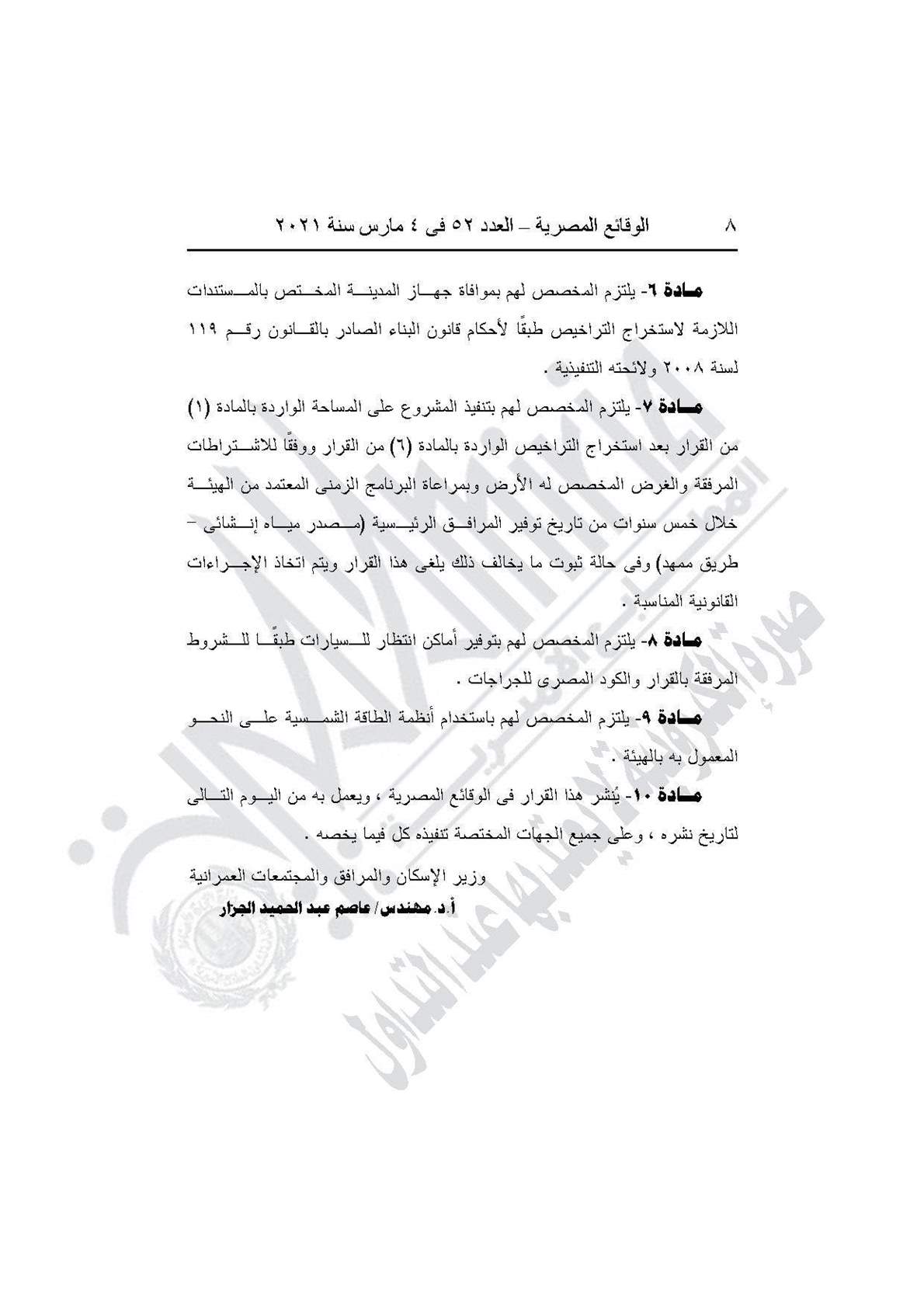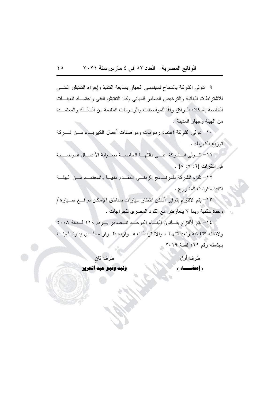 وجاء في المادة الثانية للقرار "يلتزم المخصص لهم بالتعهد الموقع منهم باستمرار التعامل مع الهيئة وجهاز المدينة وفقًا للطلب المقدم منهم في تاريخ سابق على صدور حكم محكمة القضاء الإداري الصادر الإداري الصادر بجلسة 21/1/2020، في الدعاوي أرقام 4225 لسنة 67 ق، 64657 لسنة 70 ق، 64434 لسنة 71ق، وبذات أسلوب التعامل واستغلال الأرض بنشاط سكني والتنازل عن أعمال كافة آثار الحكم المشار إليه سلفًا، مع اعتبار هذا التعهد جزءًا لا يتجزأ من العقج المبرم بينه وبين جهاز المدينة.