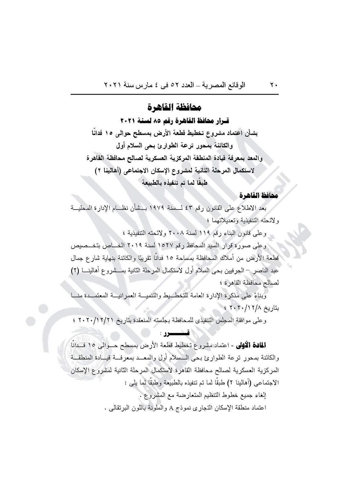نشرت جريدة الوقائع المصرية في عددها رقم 52، الصادر في 4 مارس 2021، قرار محافظة القاهرة رقم 85 لسنة 2021، بشأن اعتماد مشروع تخطيط قطعة الأرض لاستكمال المرحلة الثانية لمشروع الإسكان الاجتماعى (أهالينا 2) بحى السلام أول.