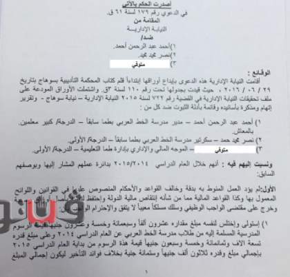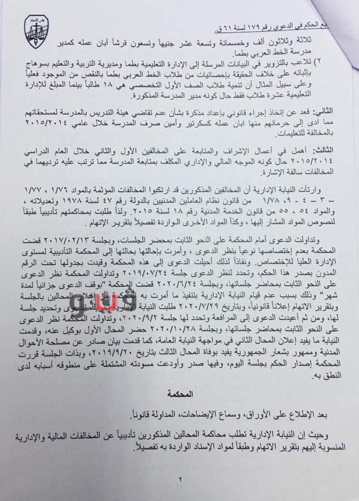 وأكدت المحكمة عبر أسباب حكمها صحة ما كشفت عنه تحقيقات النيابة الإدارية أن أحمد عبد الرحمن أحمد، خلال فترة عمله مديرًا لمدرسة الخط العربي بطما خرج على مقتضى الواجب الوظيفي وسلك مسلكًا معيبًا ولم يؤد العمل المنوط به بدقة وخالف القواعد المالية والأحكام المنصوص عليها في القوانين واللوائح المعمول بها