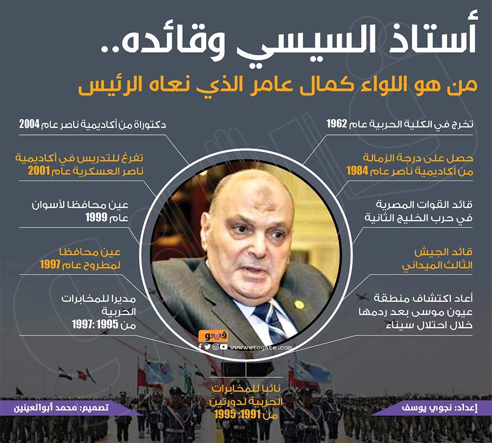 أستاذ السيسي وقائده.. من هو اللواء كمال عامر الذي نعاه الرئيس| إنفوجراف الجمعة 05/مارس/2021 - 02:53 م 3/5/2021 2:53:33 PM اللواء كمال عامر شارك طباعة 18 حجم الخط توفي أمس الخميس اللواء كمال عامر رئيس لجنة الدفاع والأمن القومي بمجلس النواب ونعاه الرئيس عبد الفتاح السيسي ووصفه بقائده وأستاذه ومعلمه شارك طباعة القوات المسلحة الرئيس السيسي المخابرات الحربية كمال عامر اللواء كمال عامر