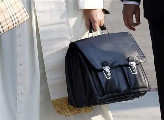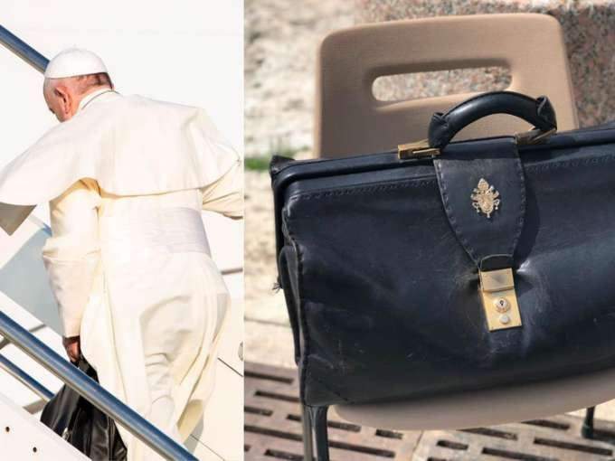 والحقيبة التي يحملها البابا في يده، ويصر على حملها بنفسه، رغم تعدد عناصر بروتوكول الفاتيكان، وأعوان الكرسي الرسولي، هي حقيبة جلدية سوداء تبدو عتيقة جدا، أو حتى بالية أحيانا.