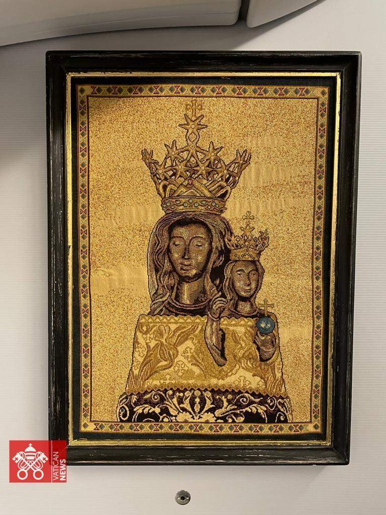 ونشر موقع الفاتيكان عبر حسابه الرسمي في "فيس بوك" صورا للطائرة من الداخل، حيث ظهرت أيقونة تحمل صورة القديس خاصة بالكنيسة الكاثوليكية.