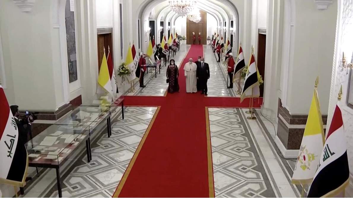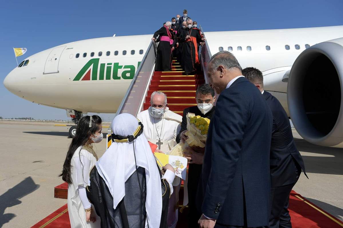 وتم استقبال البابا في مطار بغداد الدولي من قبل رئيس الحكومة العراقية مصطفى الكاظمي، وتواجد الآلاف من العراقيين على الطريق المؤدي من مطار بغداد إلى القصر الذي سيلتقي فيه الرئيس العراقي ترحيبا بأول زيارة بابوية للعراق.