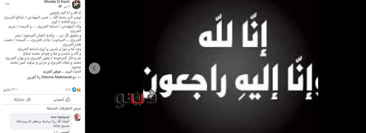 وكتبت ميريت: «إنا لله وإنا إليه راجعون، توفي إلى رحمة الله عمي المهندس صالح الحريري، والد المهندس أسامة الحريري، والسيدة مريم الحريري، وشقيق كل من والدي الفنان المرحوم عمر الحريري، والمرحوم عادل الحريري، السيدة نعمت هانم الحريري، وجد (آية ونورا وياسين وأروى أسامة الحريري، وآلاء وسلمى وچنا وچودي محمد صلاح)، عم وخال المرحومة نيڤين الحريري وپريهان الحريري، محمد ونجلاء الحريري وشيرين ومرڤت أمين ومحمد محمود».