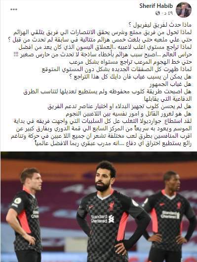 وتساءل شريف حبيب عبر صفحته علي موقع التواصل الاجتماعي فيس بوك: "ماذا حدث لفريق ليفربول؟ لماذا تحول من فريق ممتع وشرس يحقق الانتصارات إلى فريق يتلقى الهزائم حتى على ملعبه حتى بلغت خمس هزائم متتالية في سابقة لم تحدث من قبل؟".