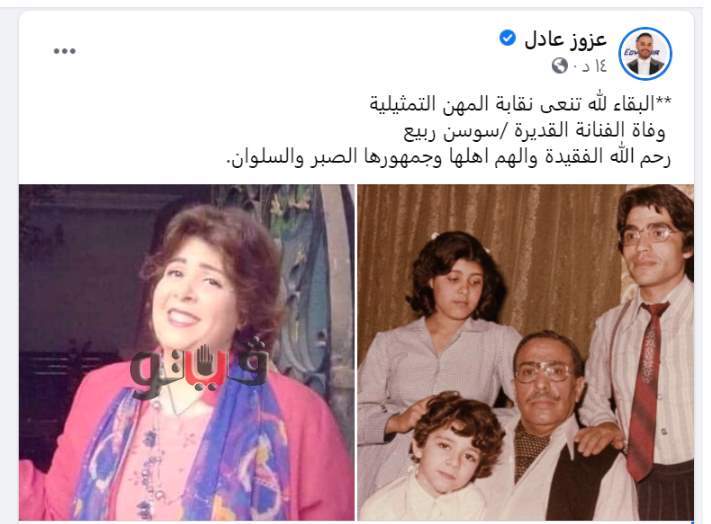 وكتب عزوز عبر صفحته الرسمية على فيس بوك، "تنعى نقابة المهن التمثيلية الفنانة القديرة سوسن ربيع، إنا لله وإنا إليه راجعون".