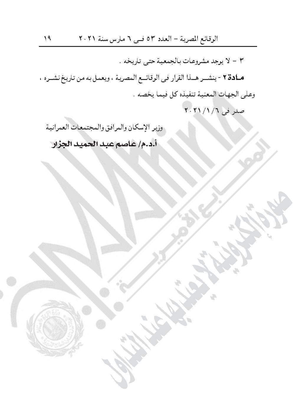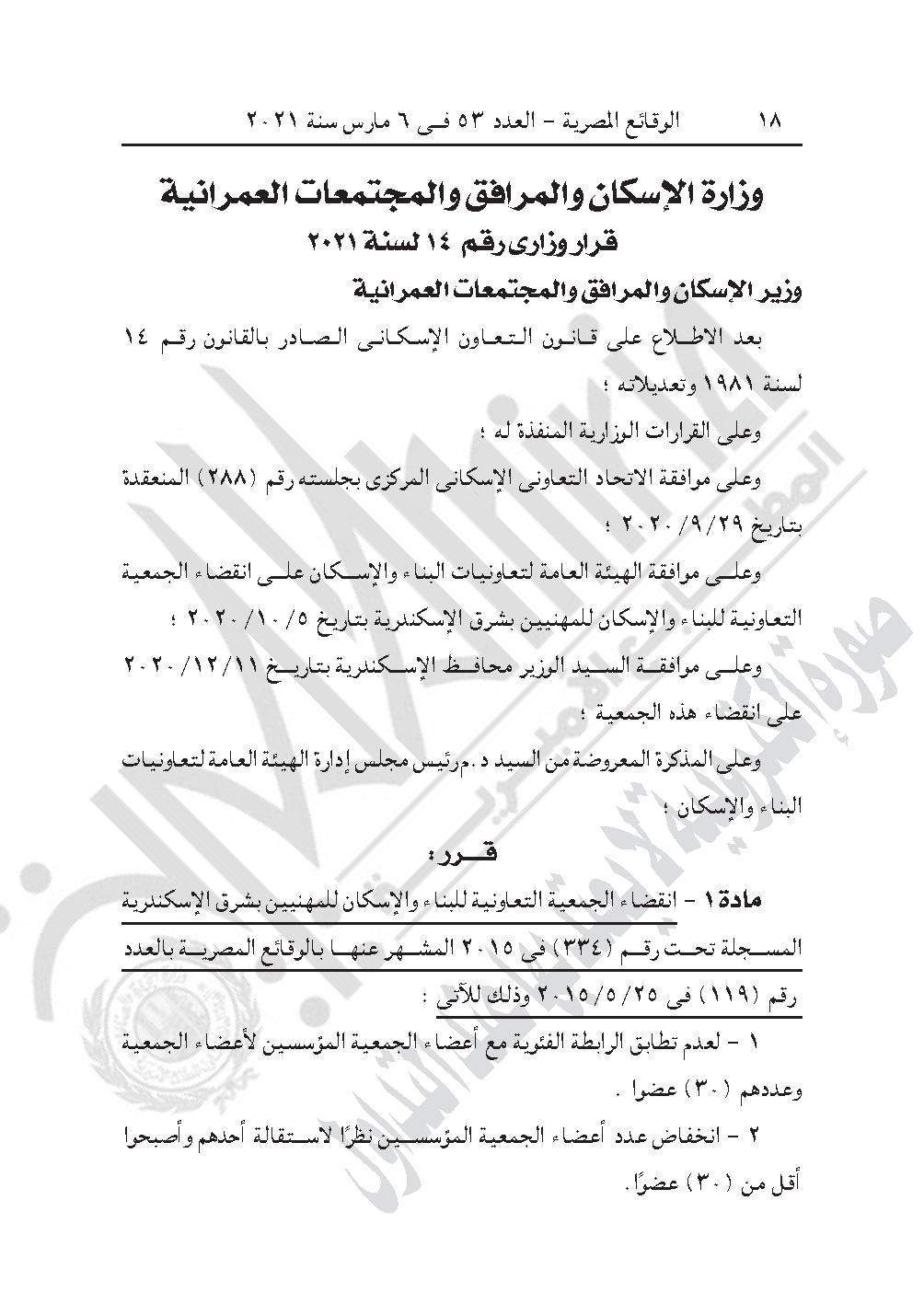 القرار رقم 14 لسنة 2021، بانقضاء الجمعية التعاونية للبناء والإسكان للمهنيين بشرق الإسكندرية المسجلة تحت رقم (334) في 2015 المشهر عنها بالوقائع المصرية بالعدد رقم (119) في 25/5/2015، لعدم تطابق الرابطة الفئوية مع أعضاء الجمعية المؤسسين لأعضاء الجمعية وعددهم 30 عضوًا.