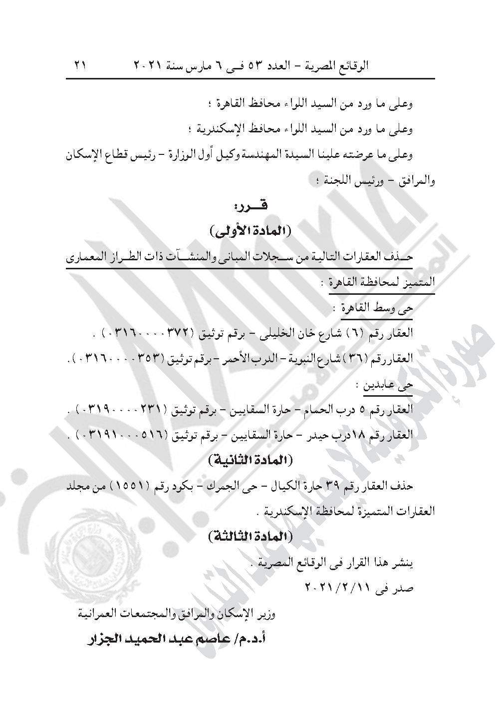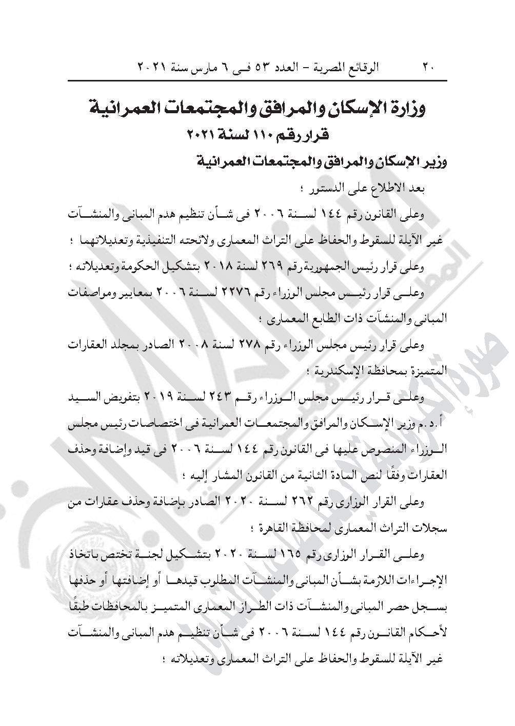 والقرار رقم 110 لسنة 2021، حذف العقارات التالية من سجلات المبانى والمنشآت ذات الطراز المعمارى المتميز لمحافظة القاهرة : حى وسط القاهرة : العقار رقم (6) شارع خان الخليلى - برقم توثيق (03160000372) . العقار رقم (36) شارع النبوية - الدرب الأحمر - برقم توثيق (03160000353). حى عابدين : العقار رقم 5 درب الحمام - حارة السقايين - برقم توثيق (03190000231) . العقار رقم 18درب حيدر - حارة السقايين - برقم توثيق (03191000516) .