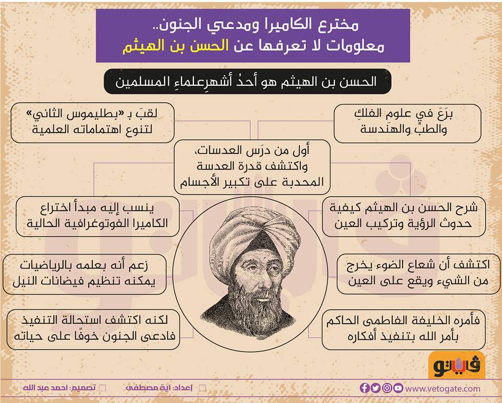 مخترع الكاميرا ومدعي الجنون.. معلومات لا تعرفها عن الحسن بن الهيثم | انفوجراف الأحد 07/مارس/2021 - 01:09 م 3/7/2021 1:09:32 PM الحسن بن الهيثم آية مصطفى شارك طباعة 18 حجم الخط تمر اليوم ذكرى رحيل العالم الحسن بن الهيثم، الذى رحل عن عالمنا يوم 6 مارس من عام 1040م. يعتبر بن الهيثم من الرعيل الأول للعلماء المسلمين اللذين ابتكروا مباديء التصوير شارك طباعة الحاكم بامر الله الحسن بن الهيثم تركيب العين