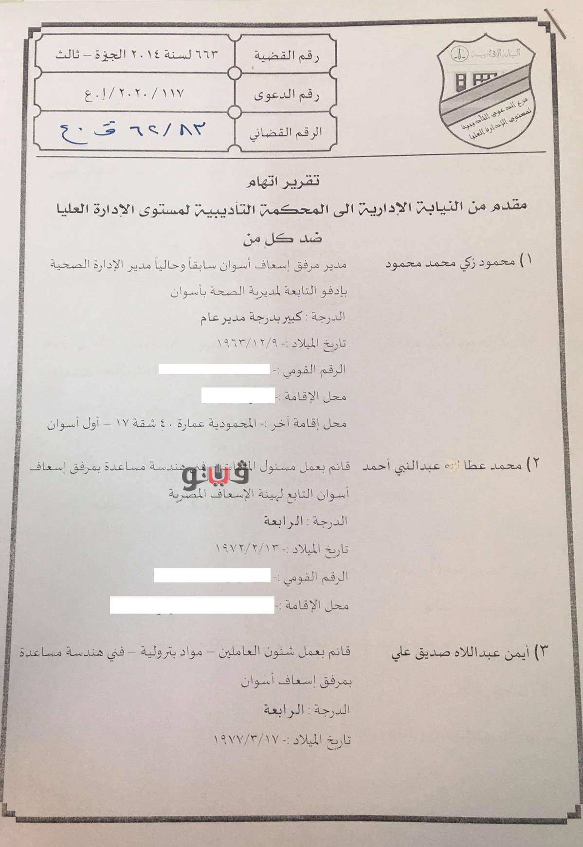 أكد تقرير الإتهام في القضية رقم 83 لسنة 62 قضائية عليا أن المحالين الخمسة بدائرة هيئة الإسعاف المصرية، ومرفق إسعاف أسوان لم يؤدوا العمل المنوط بهما بدقة وأهملا فى عملهما مما ترتب عليه المساس بمصلحة مالية لجهة عملهم.