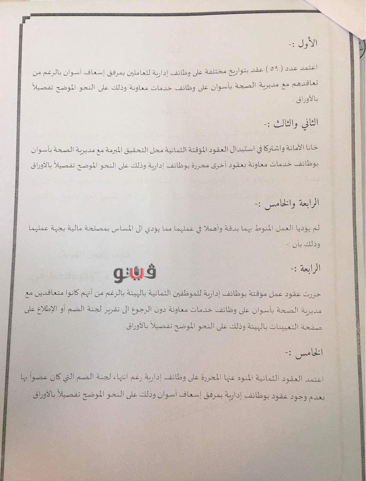 وتبين أن محمود ذكي محمد، مدير عام الإدارة الصحية بإدفو خلال فترة عمله مدير مرفق إسعاف أسوان التابع لهيئة الإسعاف المصرية إعتمد عدد (59) عقد بتواريخ مختلفة على وظائف إدارية للعاملين بمرفق إسعاف أسوان بالرغم من تعاقدهم مع مديرية الصحة بأسوان على وظائف خدمات معاونة .