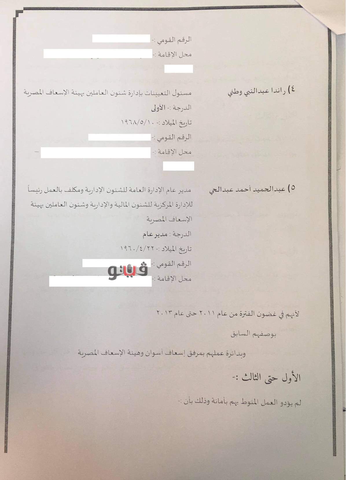 رصد تقرير قضائي مهم صادر عن النيابة الإدارية وقائع فساد مالي وإداري من العيار الثقيل داخل جدران هيئة الإسعاف المصرية ومرفق إسعاف أسوان، أحيل على إثرها وكيل وزارة و4 مسئولين آخرين للمحاكمة العاجلة بعد ثبوت إرتكابهم مخالفات جسيمة في تعاقدات وظائف إدارية بالمخالفة للقانون.