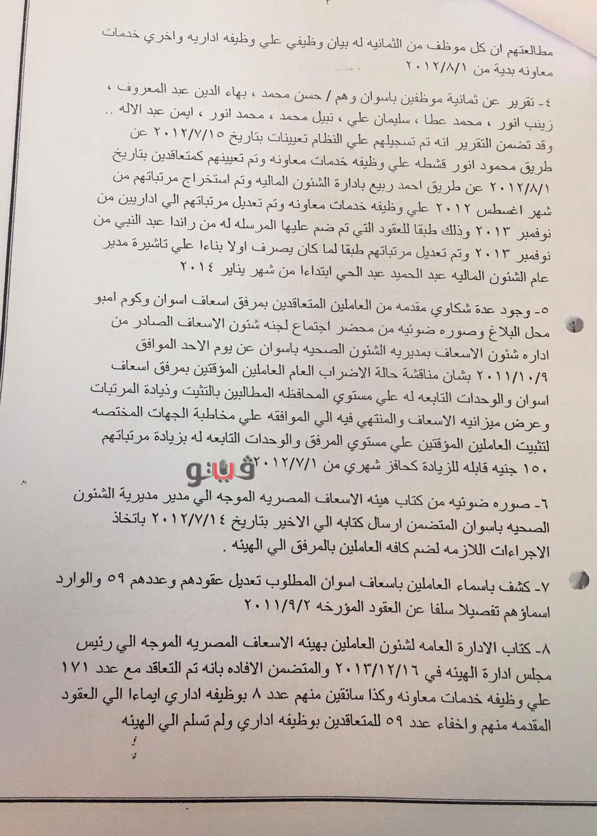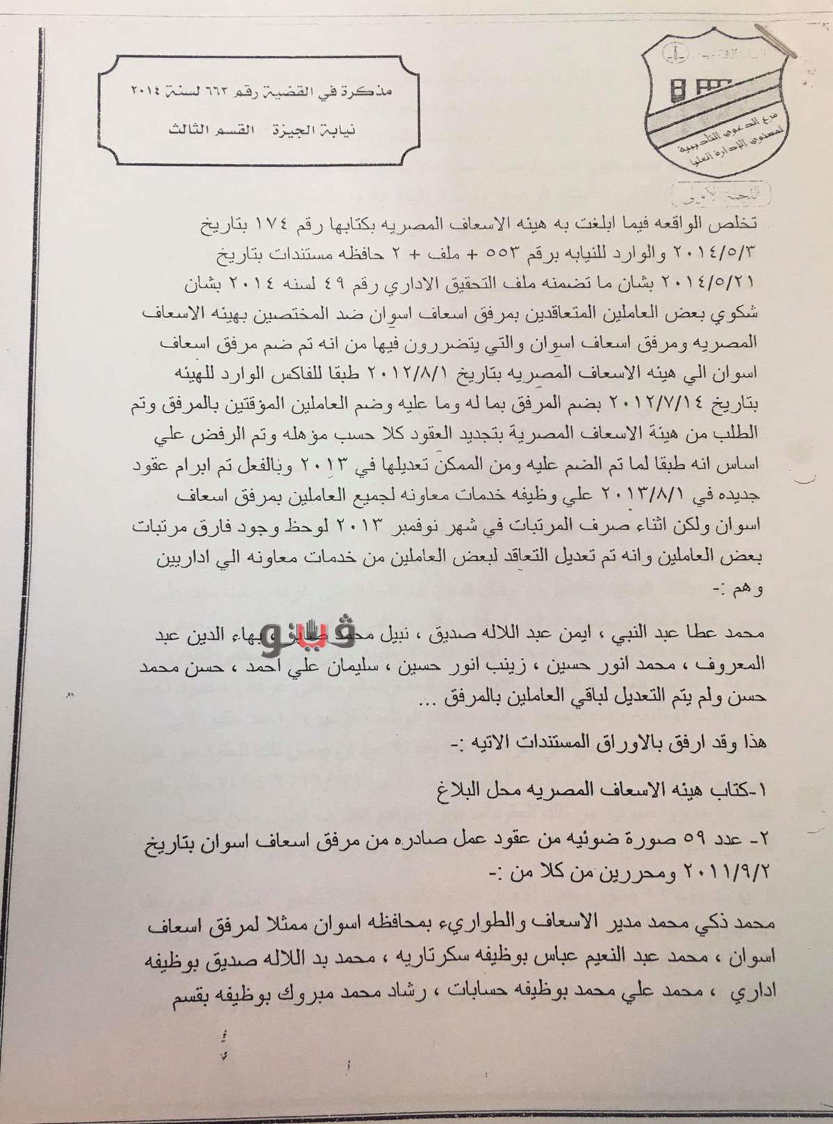 كما تضمنت مستندات القضية مذكرة هيئة الإسعاف المصرية الموجهة إلى رئيس مجلس الإدارة بشأن كتاب الإدارة العامة لشئون العاملين للبحث والإفادة عن تقديم شكوى جماعية للعاملين وعددهم ٥٩ الحاصلين على تعاقد إداري بالمرفق وإخفاء عقودهم بالمرفق والتعاقد معهم بوظيفة خدمات معاونة بالهيئة والمنتهى فيها إلى عدم جواز تعديل للعقود من وظيفة خدمات معاونة إلى وظيفة إداري حتى يتم تصنيفهم حسب المؤهل ويتم وقف صرف مستحقات العاملين الذى تم تعديل عقودهم بمعرفة شئون العاملين على أن يتم إحالة الموضوع للشئون القانونية.