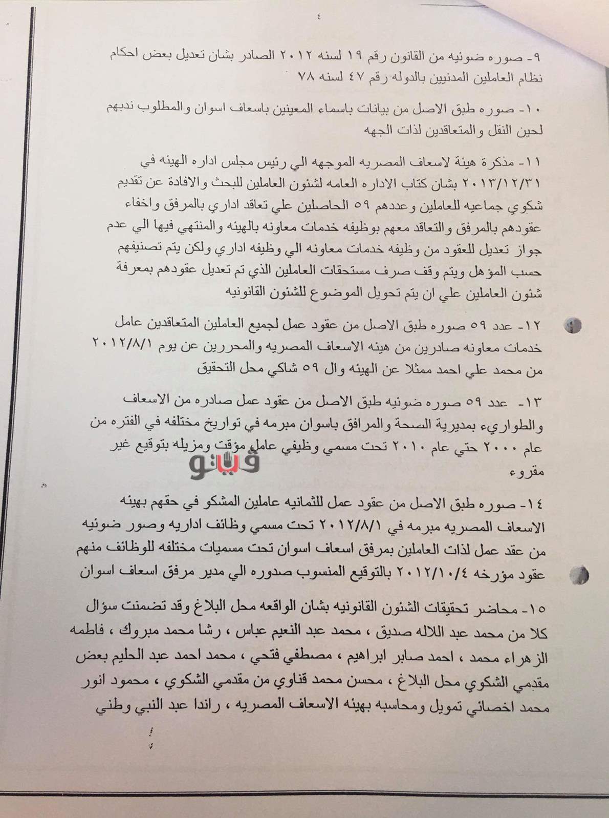 وأرفق بالأوراق كتاب هيئة الإسعاف المصرية محل البلاغ وعدد ٥٩ صورة ضوئية من عقود عمل صادرة من مرفق إسعاف أسوان ومحررين من كلاً من محمد ذكى محمد مدير الإسعاف والطوارئ بمحافظة أسوان ممثلاً لمرفق إسعاف أسوان ومحمد على محمد بوظيفة حسابات ورشاد محمد مبروك بوظيفة بقسم السكرتارية صورة ضوئية من قانون نظام العاملين المدنيين بالدولة وصورة طبق الأصل من بيانات بأسماء المعينين بإسعاف أسوان والمطلوب ندبهم لحين النقل والمتعاقدين لذات الجهة .
