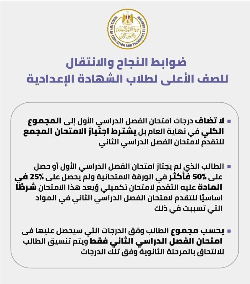 وبالنسبة لضوابط النجاح والانتقال للصفوف الأعلى للشهادة الإعدادية: