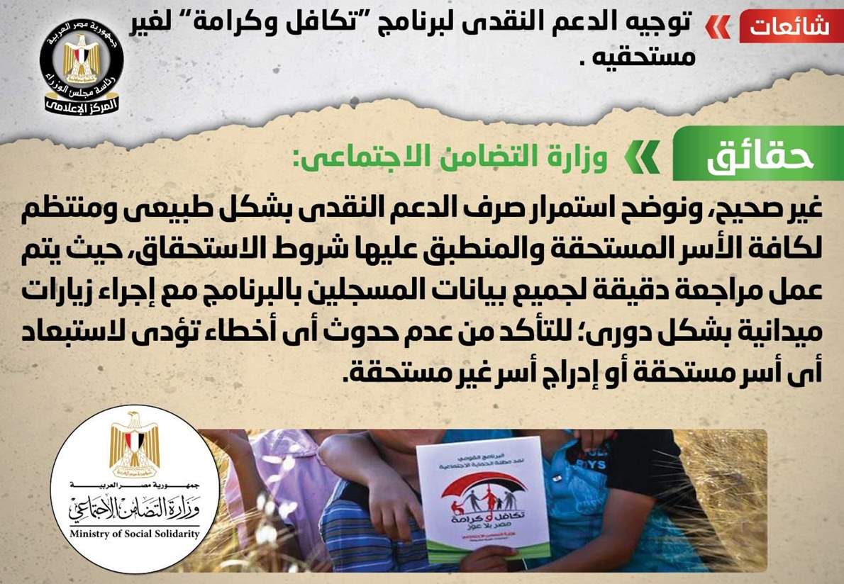 وتواصل المركز الإعلامي لمجلس الوزراء مع وزارة التضامن الاجتماعي، والتي نفت تلك الأنباء، مُؤكدةً أنه لا صحة لتوجيه الدعم النقدي لبرنامج "تكافل وكرامة" لغير مستحقيه.