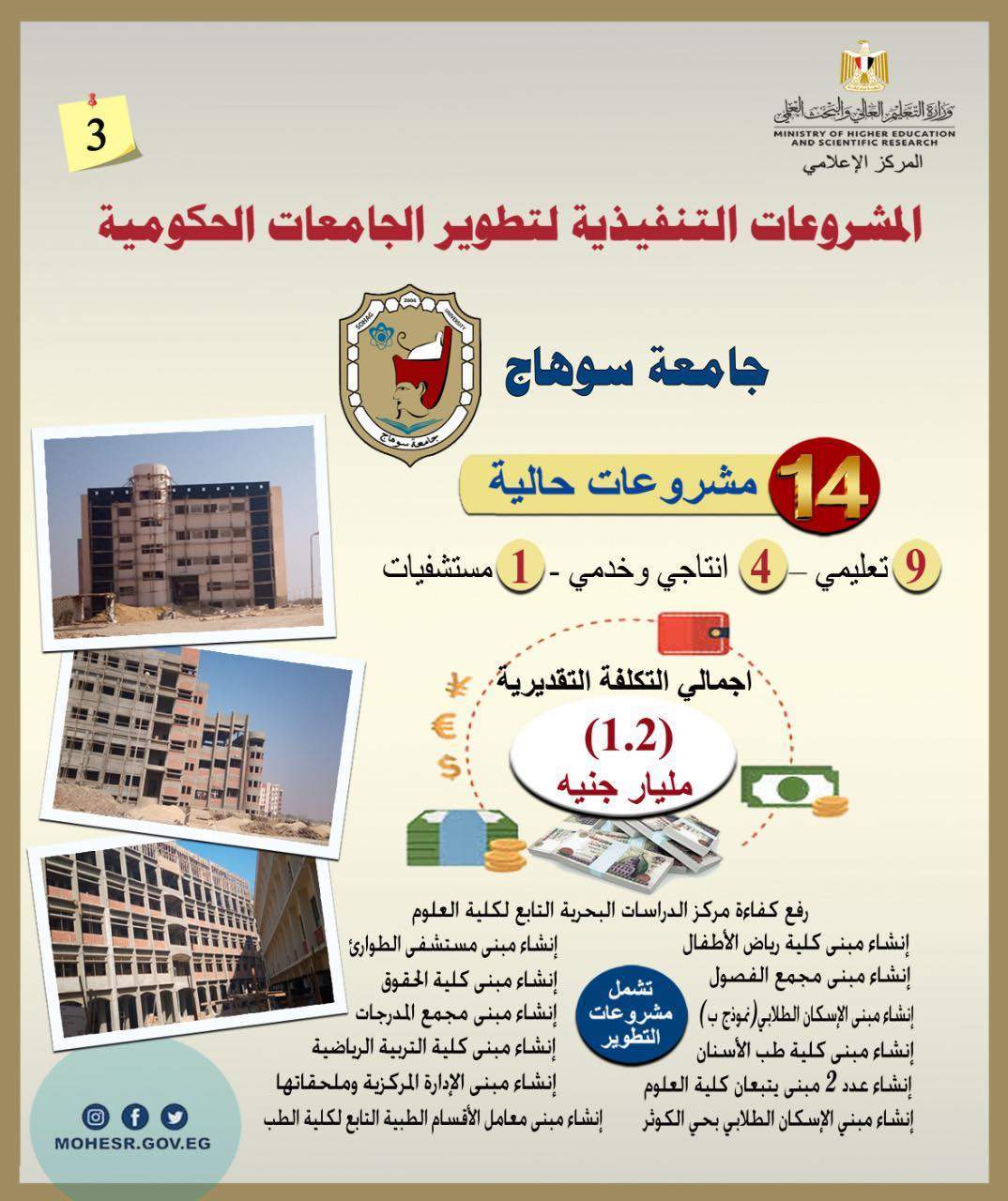 وأوضح التقرير أن التكلفة الإجمالية للمشروعات الجاري تنفيذها في جامعة سوهاج تبلغ نحو (1.2) مليار جنيه.