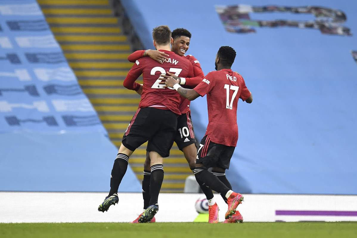بدأ مانشستر يونايتد بضغط مكثف على أصحاب الأرض، ولم تمر سوى 40 ثانية حتى نجح اليونايتد في الحصول على ركلة جزاء لصالح مارسيال بعدما تمت عرقلته من جانب جابرييل خيسوس، ليسددها برونو فيرنانديز الكرة أرضية قوية على يمين حارس السيتي مسجلا الهدف الأول.