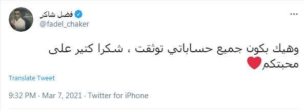 وكتب فضل شاكر قائلا: "وهيك بكون جميع حساباتي توثقت، شكرا كتير على محبتكم".