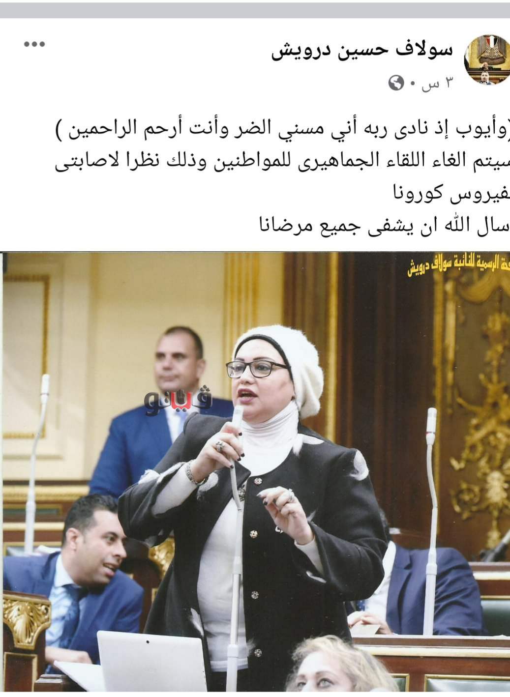 أعلنت النائبة سولاف درويش، عضو مجلس النواب عن محافظة القليوبية، إصابتها بفيروس كورونا المستجد، وقالت عبر صفحتها الرسمية بموقع التواصل الاجتماعي "فيس بوك": (وَأَيُّوبَ إِذْ نَادَىٰ رَبَّهُ أَنِّي مَسَّنِيَ الضُّرُّ وَأَنتَ أَرْحَمُ الرَّاحِمِينَ).
