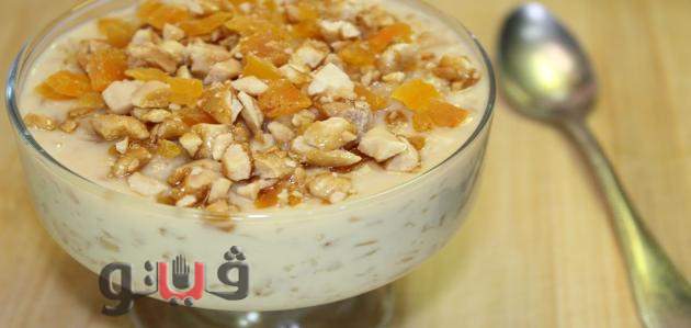 - نضيف إليه الشوفان لمدة خمس دقائق، ونغطي الطبق، ثم نتركه قليلاً لمدة خمس دقائق.